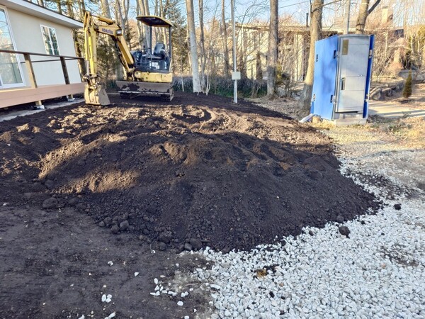 ABN様邸・KYO・雨落ち砂利入れ、黒土搬入、敷き均し