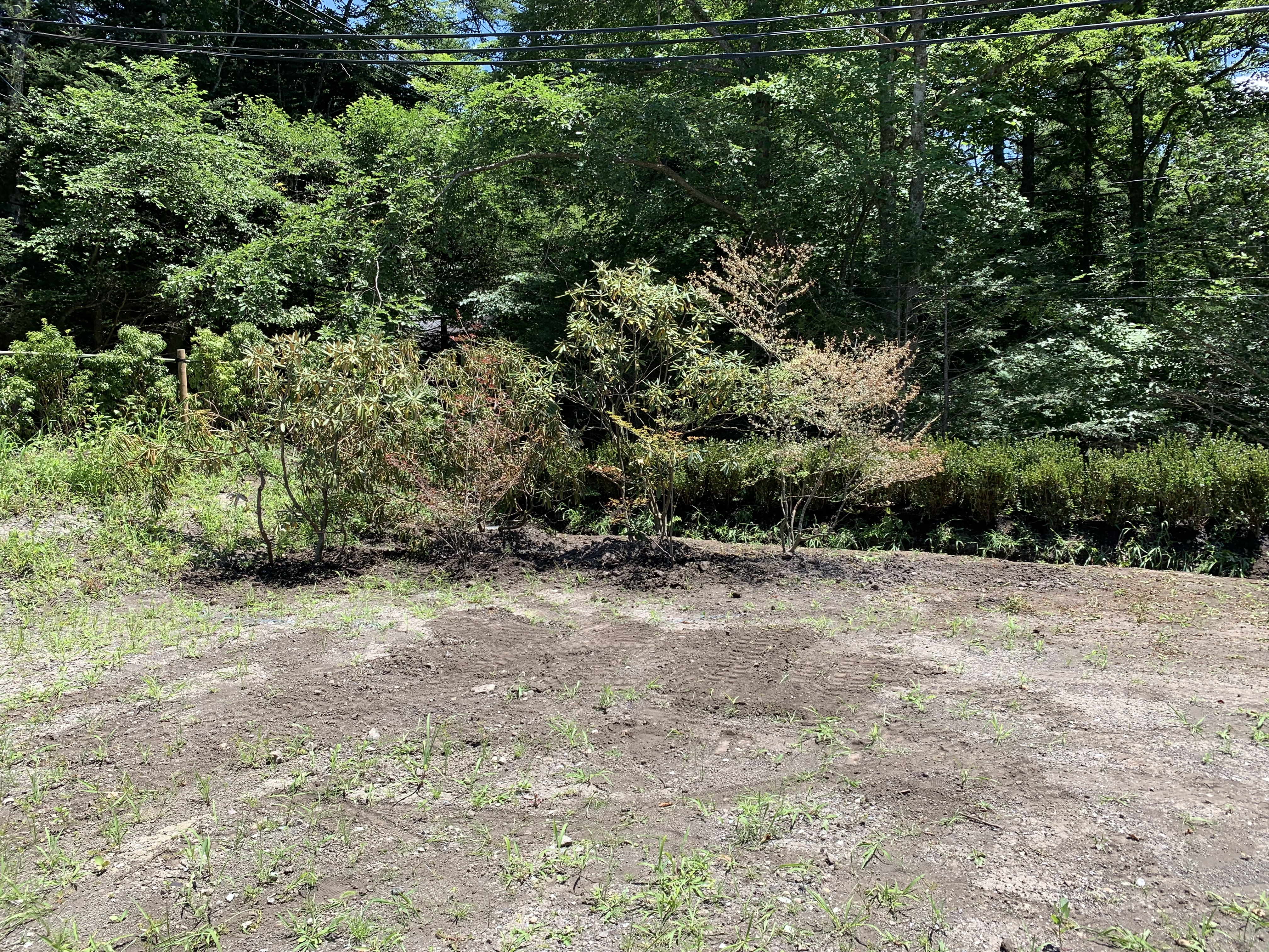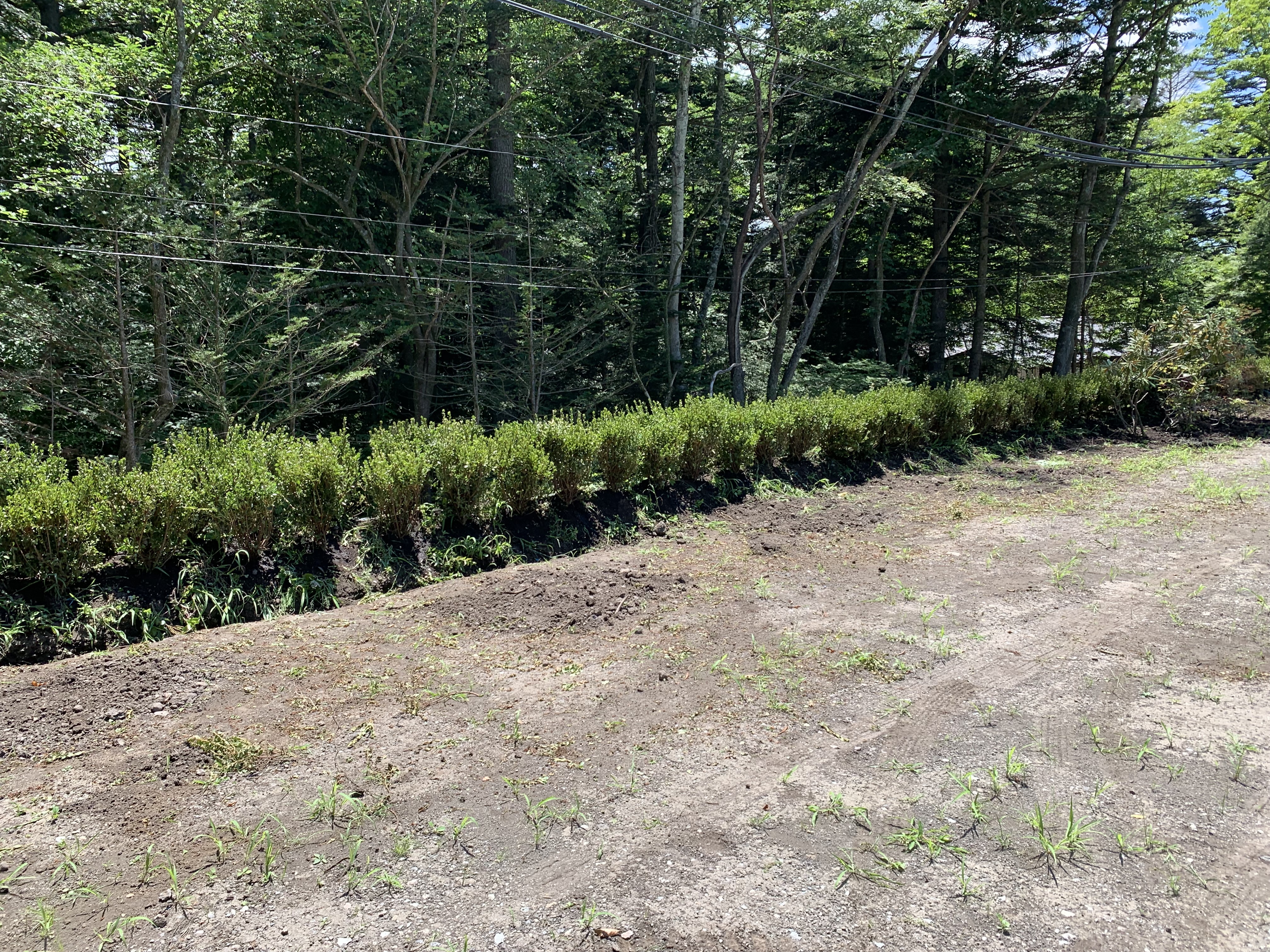 植栽(ツツジ200本)、置き場からミニユンボを現場へ運搬、並列だった植木を寄せ植えに変更、現場からミニユンボを置き場へ回送、水やり