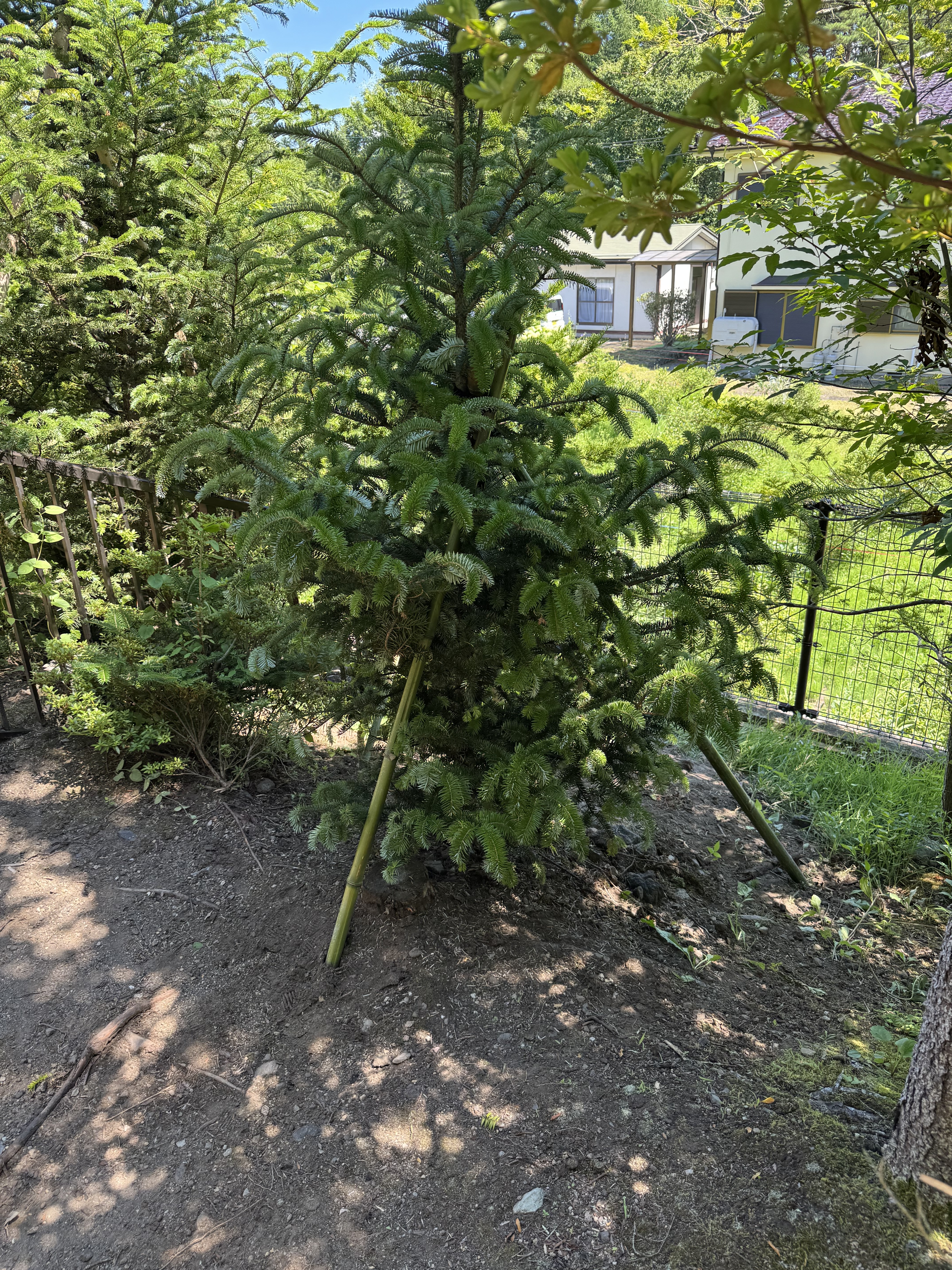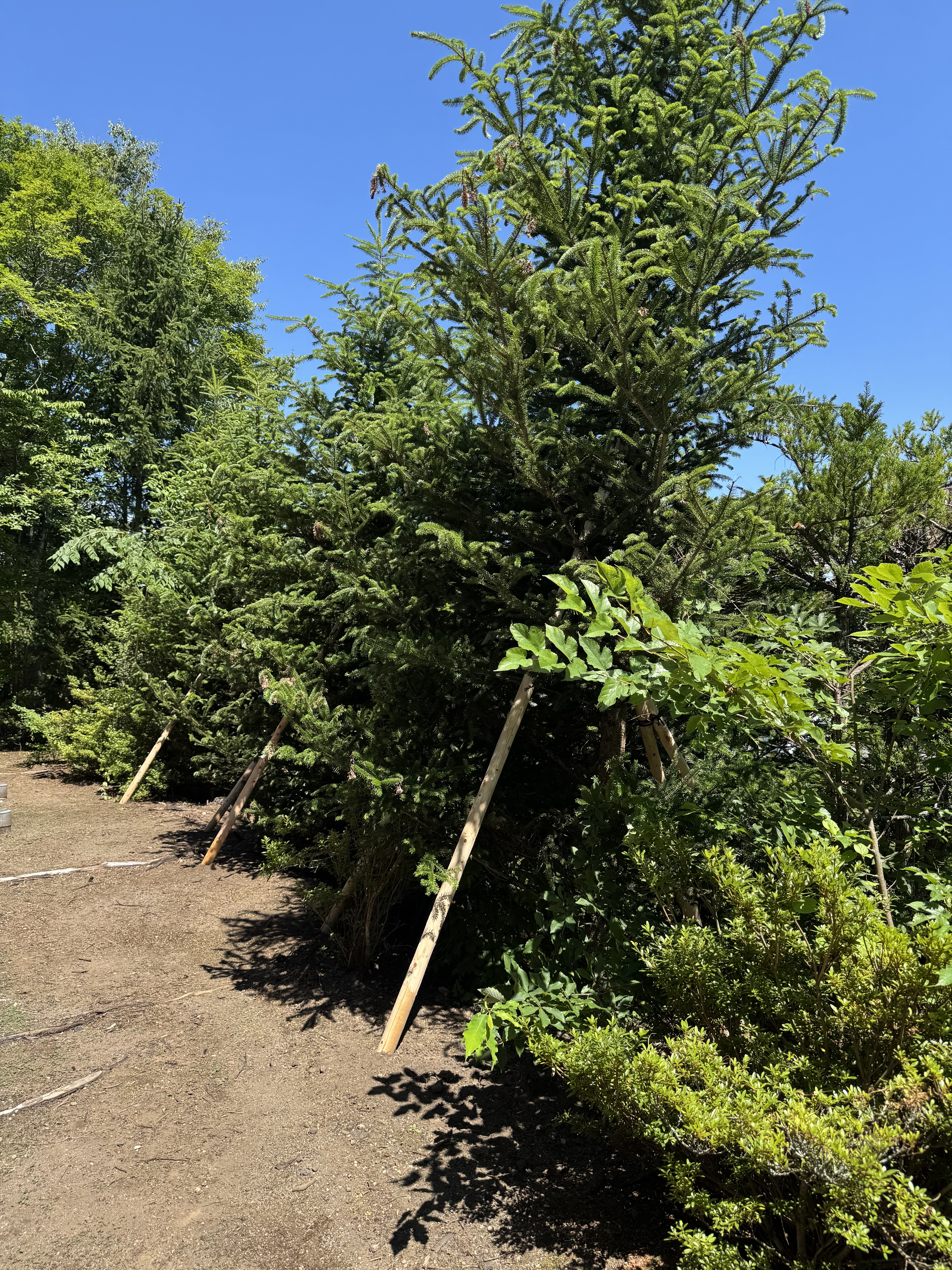 7時30分から17時15分、PDマンション様邸、モミ5m、モミ2.5m、イチイ3m、イチイ2m、シャラ5m、エゴ3m支柱取り付け、ツツジ、白樺、サクラ、リョウブ、アズキナシ剪定。