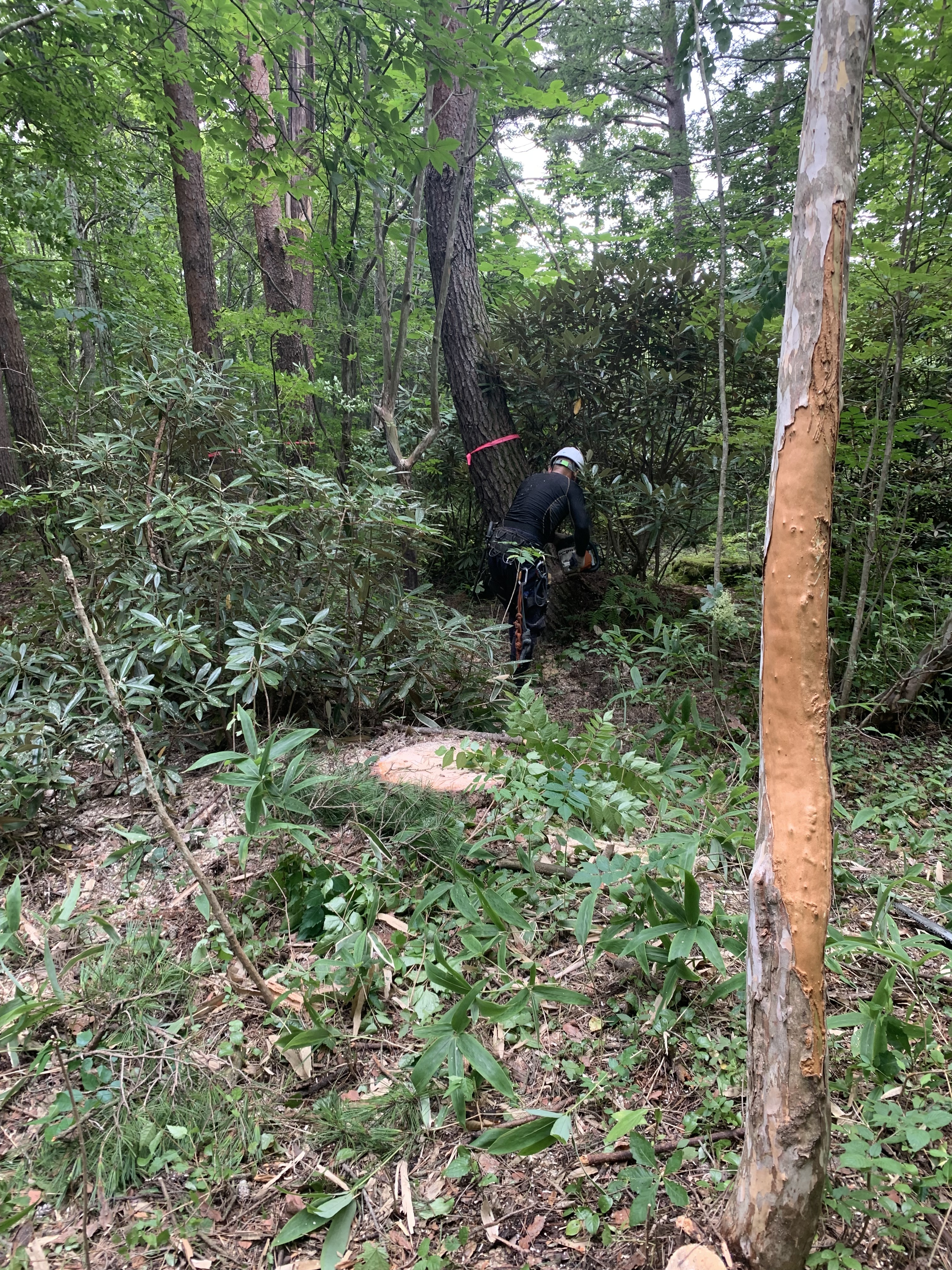 ユンボ、ダンプ、クレーン、チェンソー、ブロワー使用