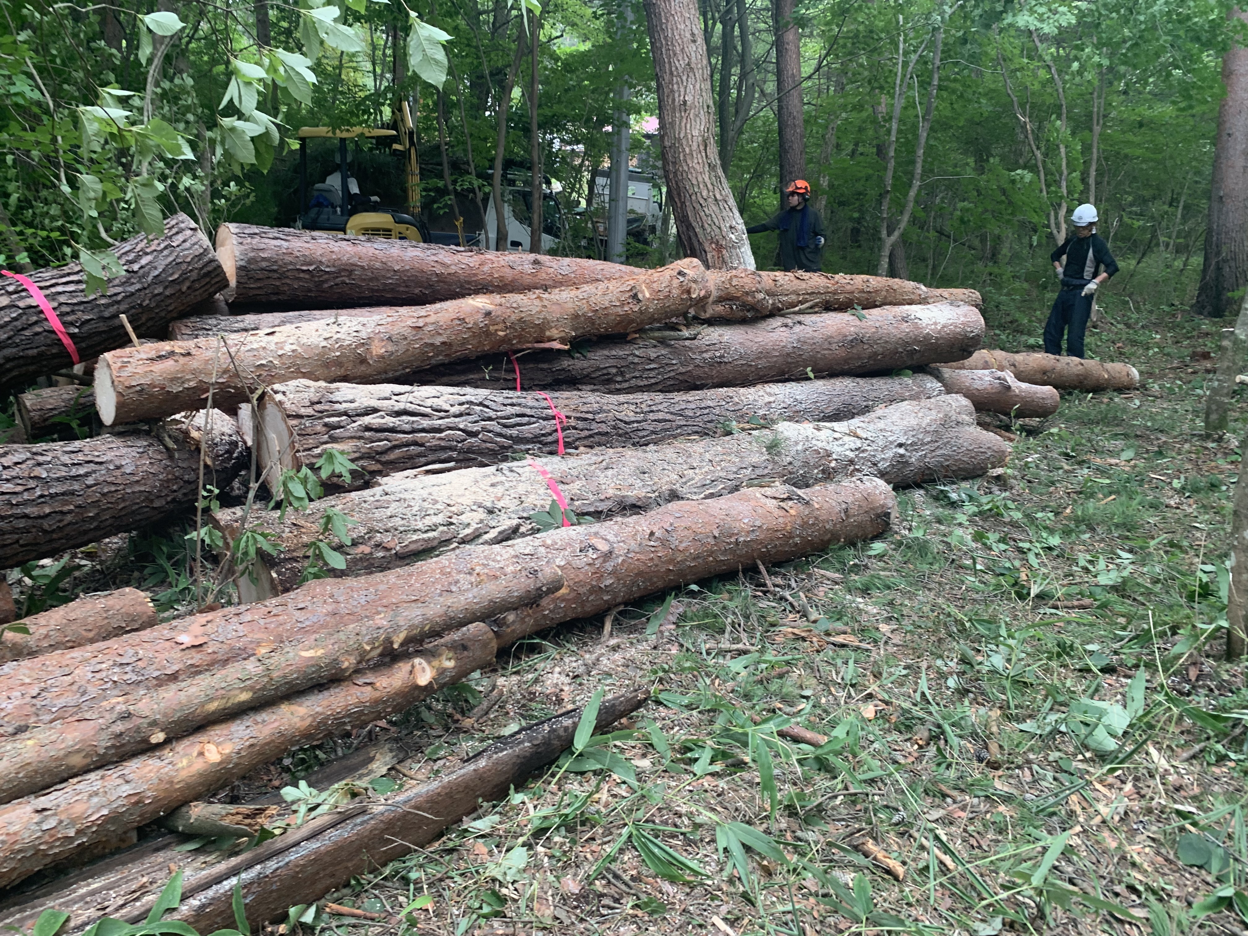 朝、待ち合わせし現場へ集合、クレーン伐採(赤松11本)、枝ゴミ2台搬出、丸太1台家に運搬下ろして終了