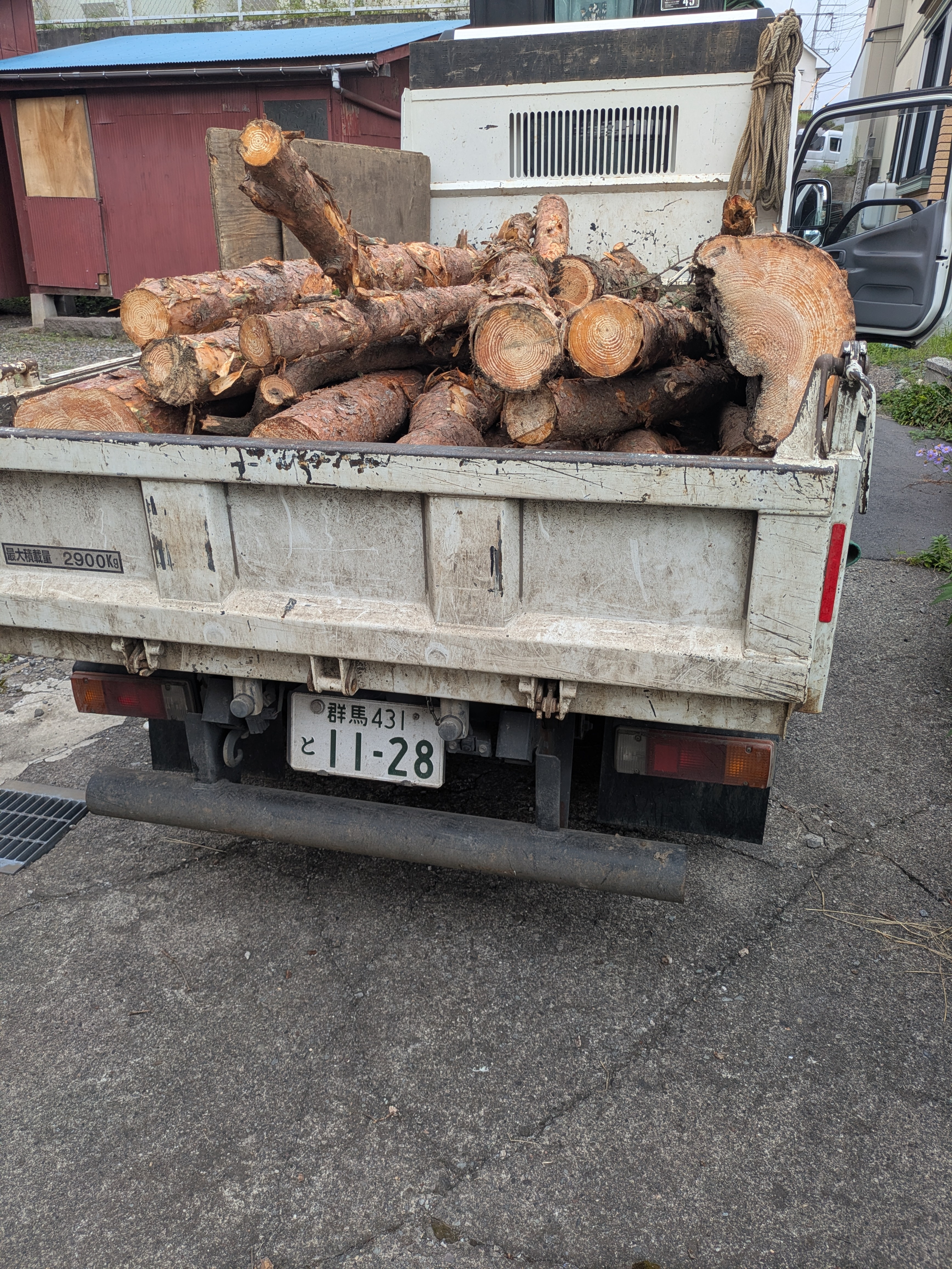 KMO様邸から、木材製材場に赤松 4m9本 3m3本運搬