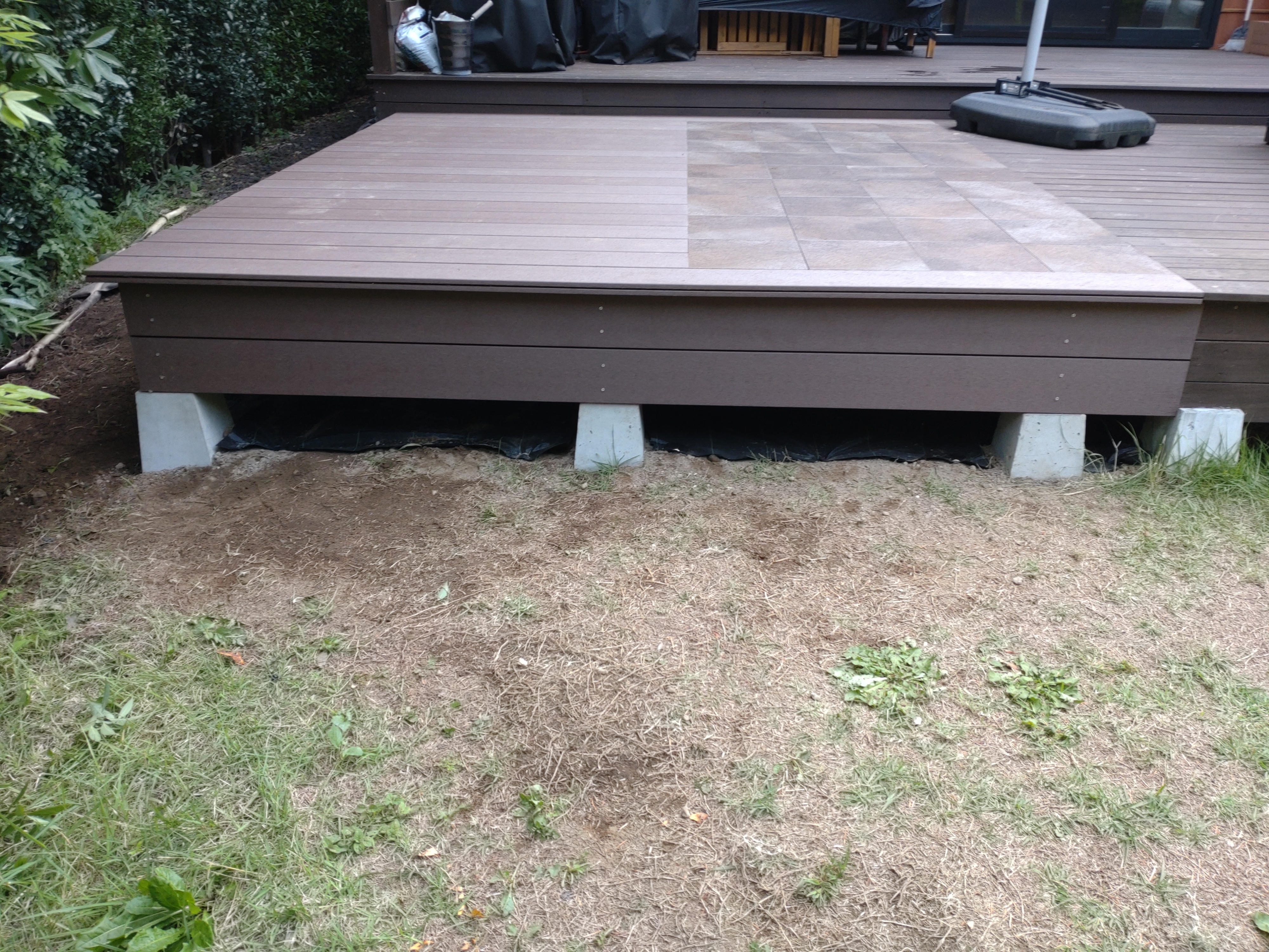 デッキ製作は終了しました。残り作業は倉庫組み立て設置とシラカシ移植、土入れです。