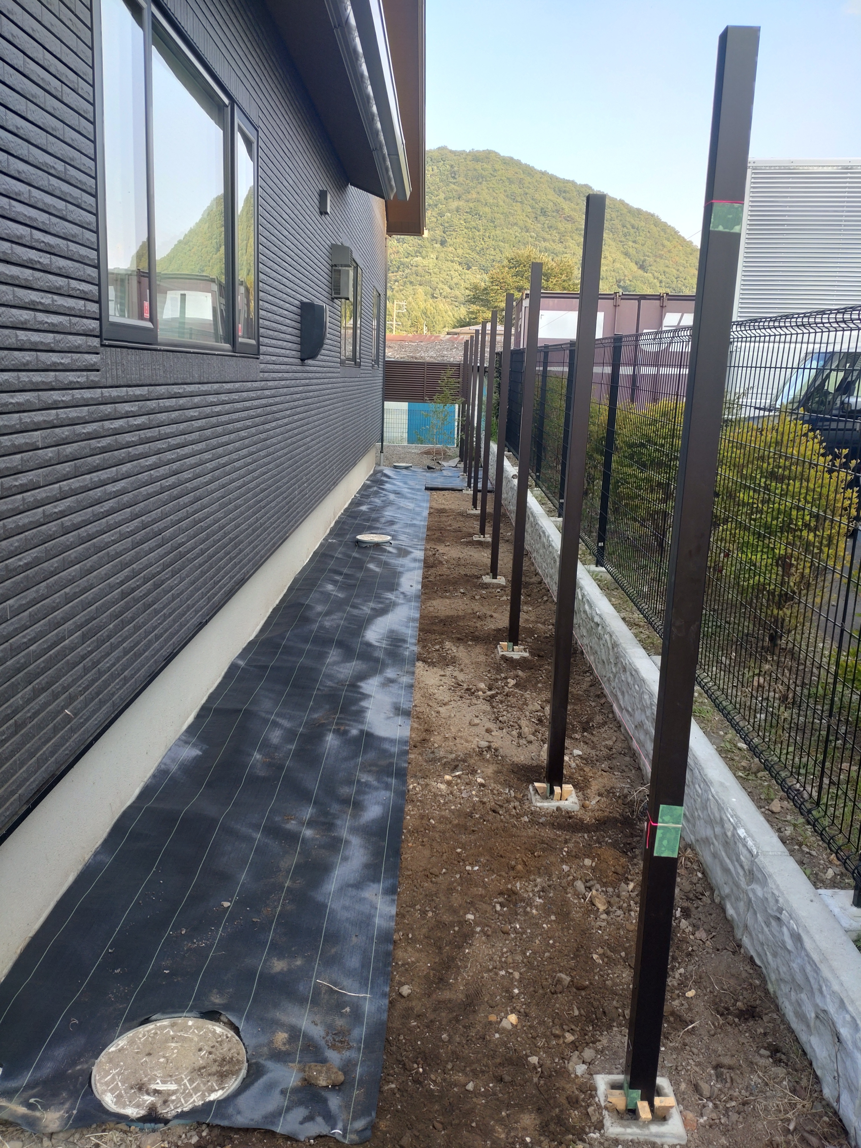 フェンス支柱たて、モルタル入れ、防草シート敷き