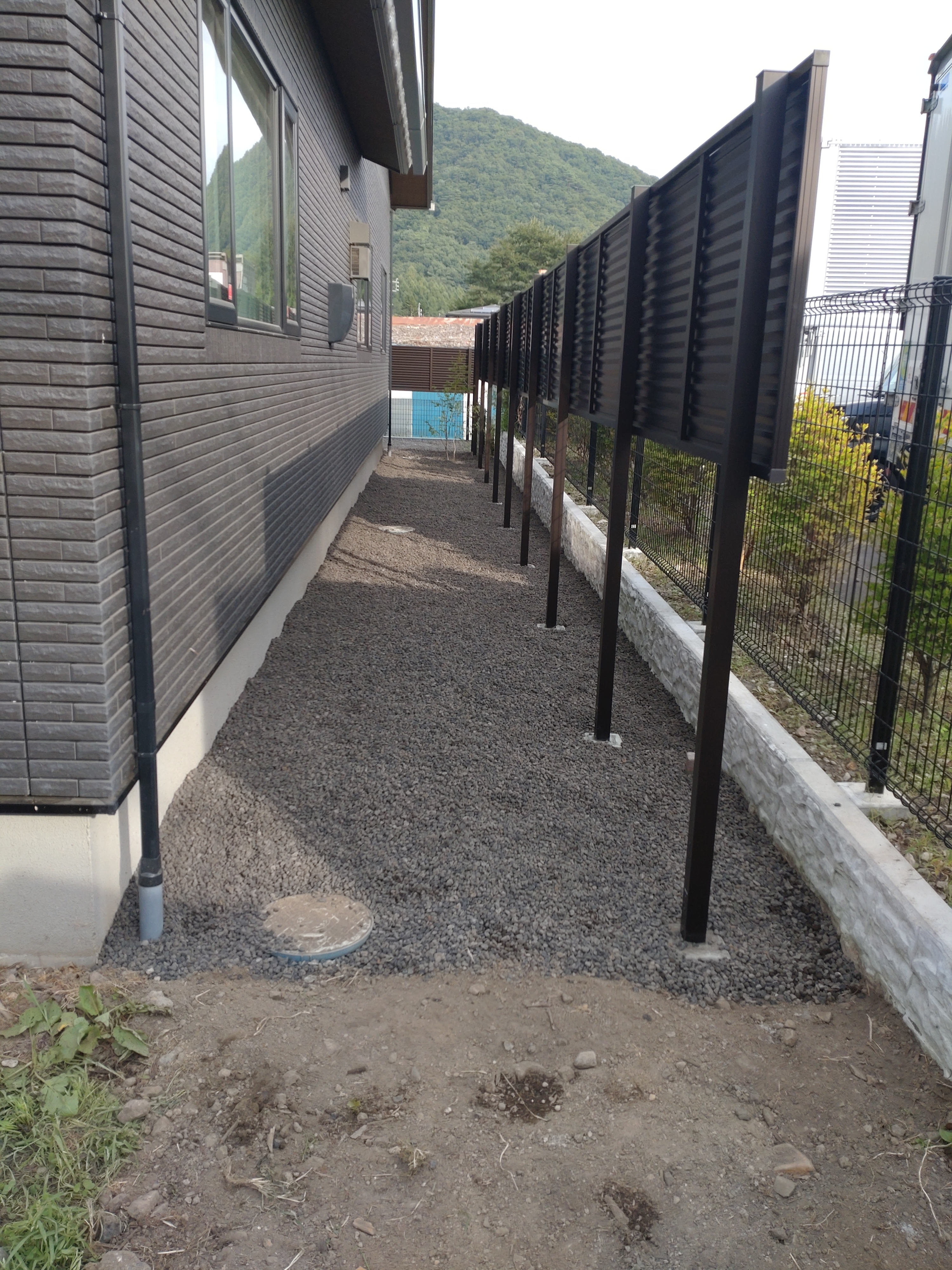 砂利屋さんに浅間石のビリ2㎥引き取りフェンス工事を行ってるところに敷き均し再度0.5㎥引き取り敷き均し