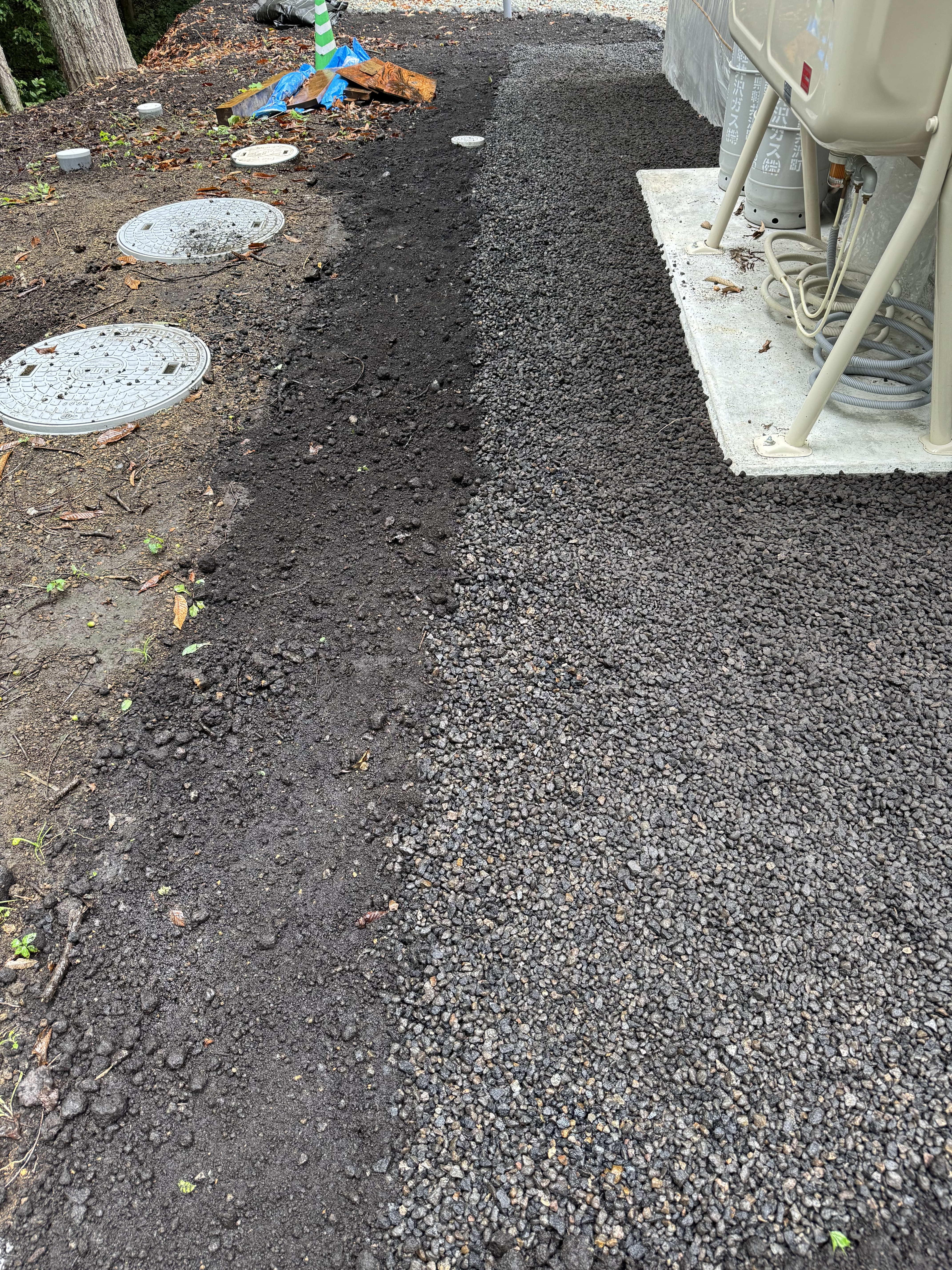 7時50分から16時40分、UC様邸、雨落ち、防草シート敷き、ビリ敷き6.5m3