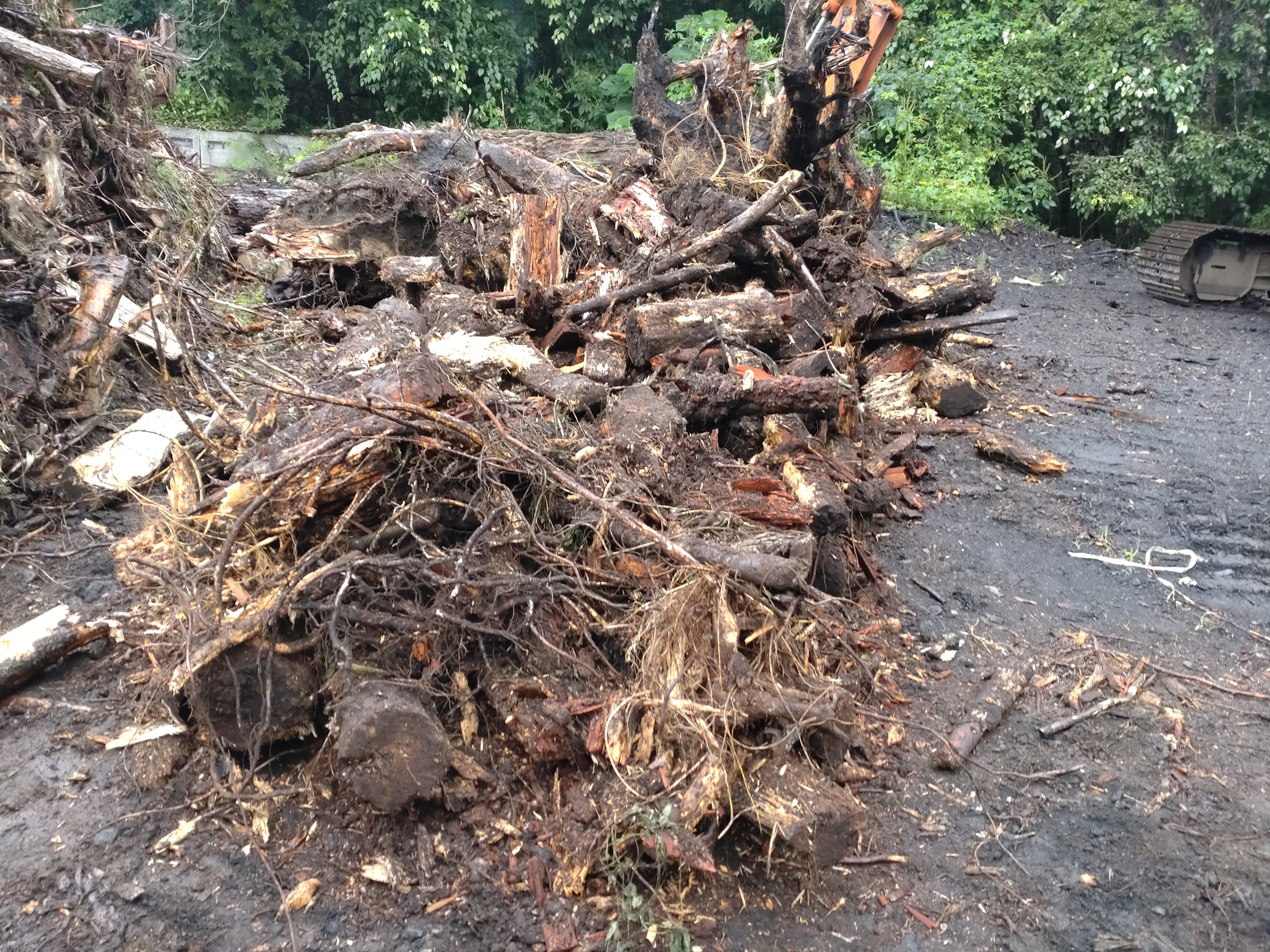 午前中に16個抜根し午後に入ってバックホーのバゲットをハサミに取り替え埋まっている風倒木を掘り出し
