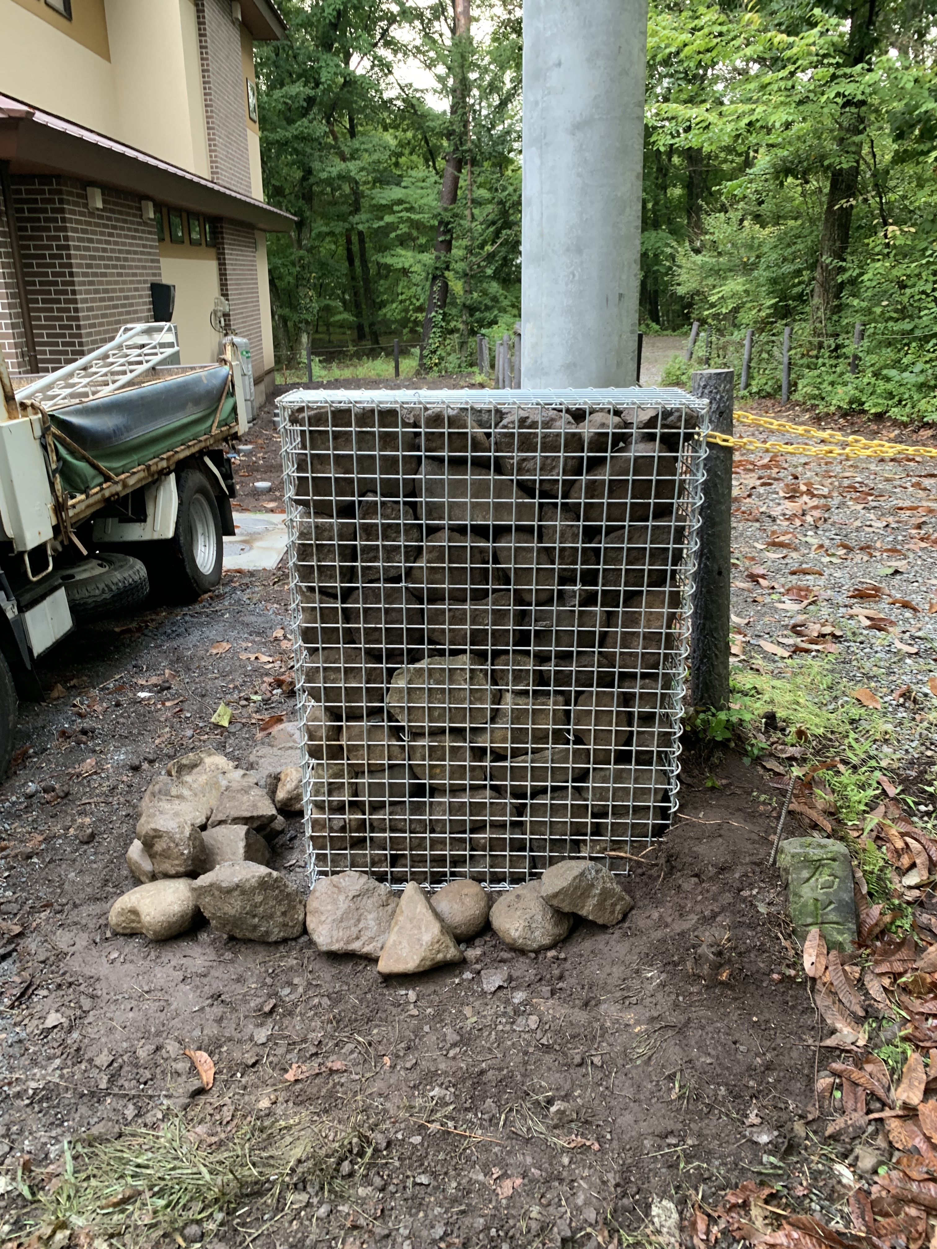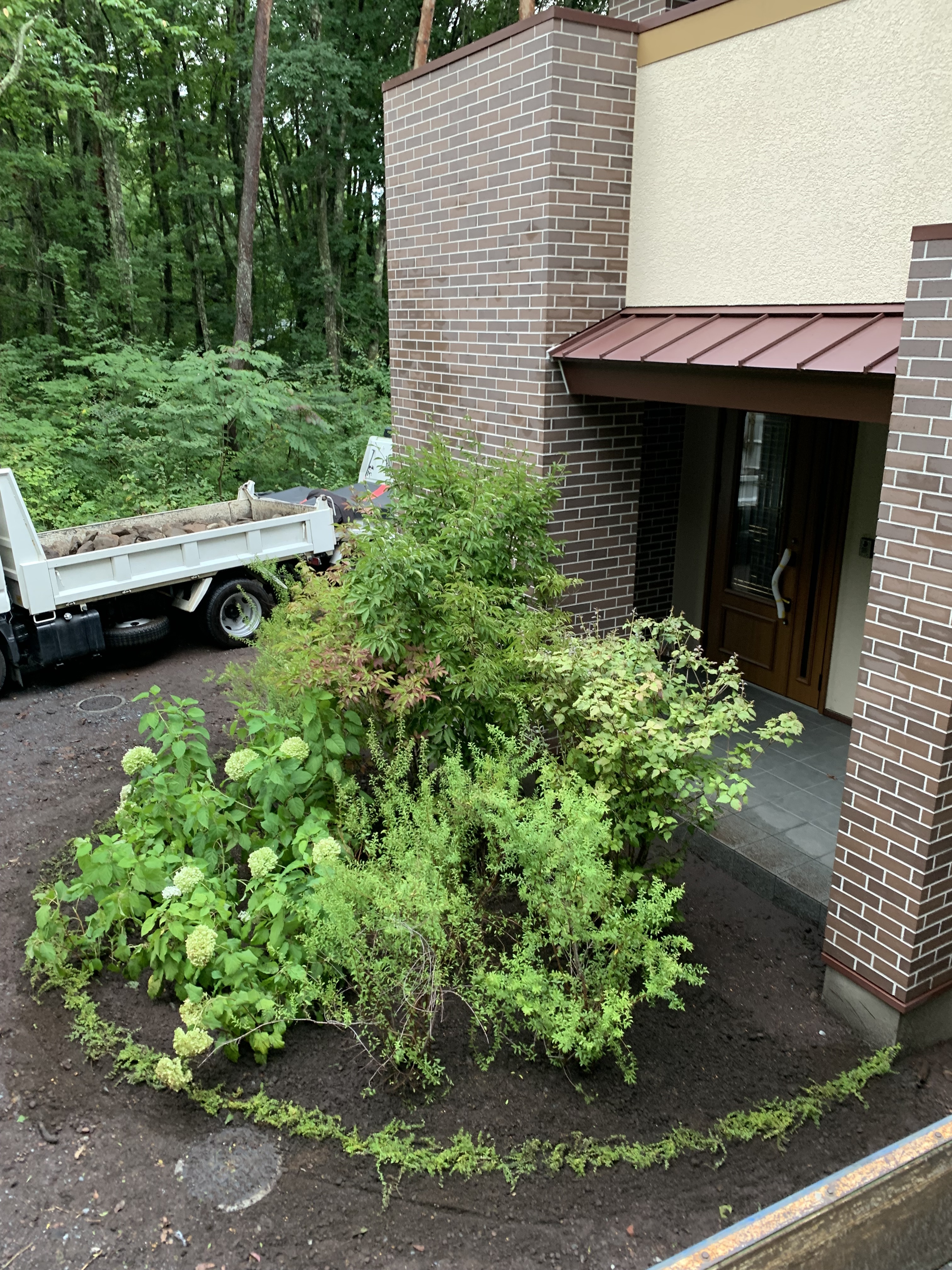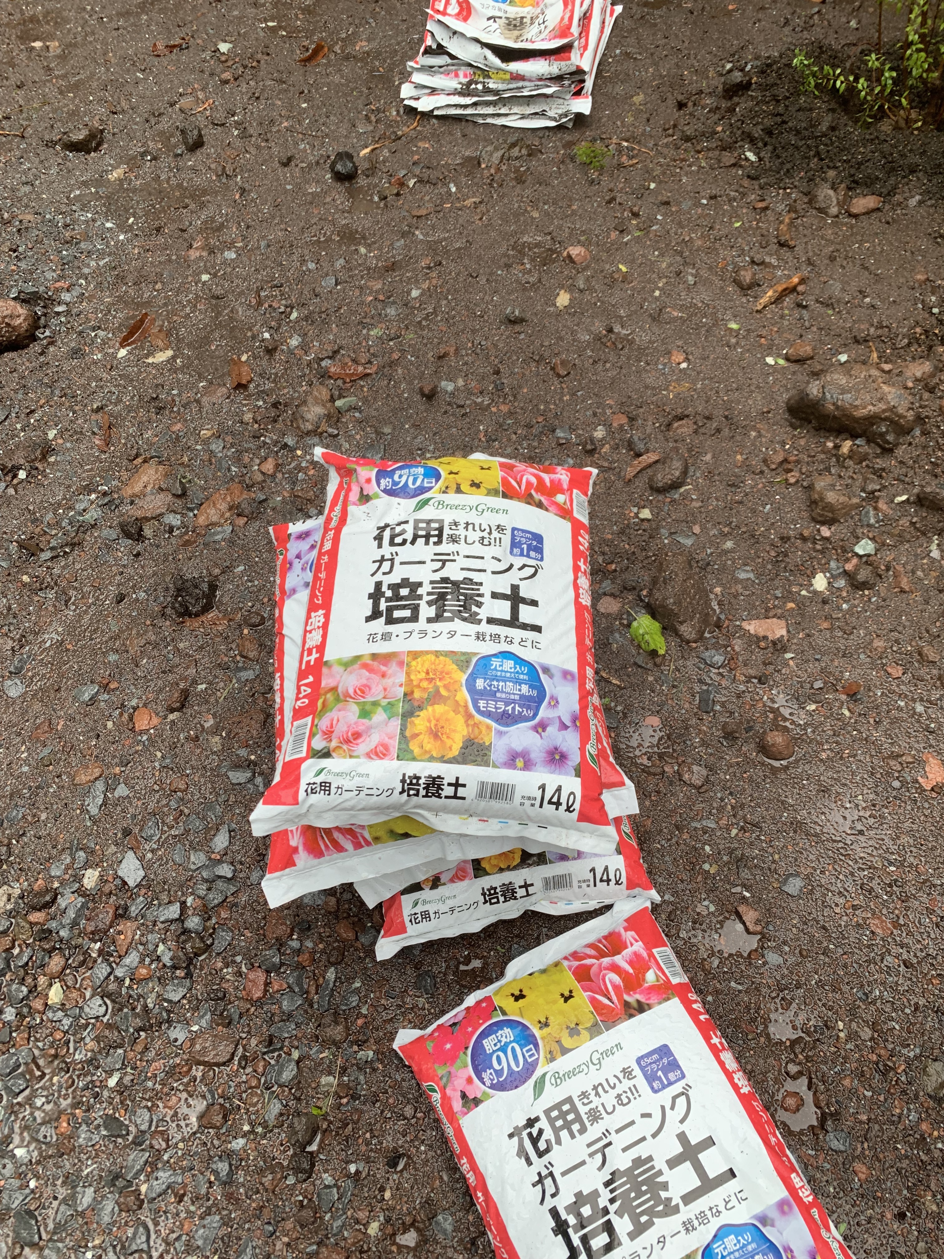 朝、植木屋さんから植木を積み込み現場へ運搬、社長と植木の配置、植え込み、黒土の鋤き込み、水やり、整地、ガビオン組み立て、設置(ガビオンの網カットの為ホームセンターでカッター購入)、石詰め