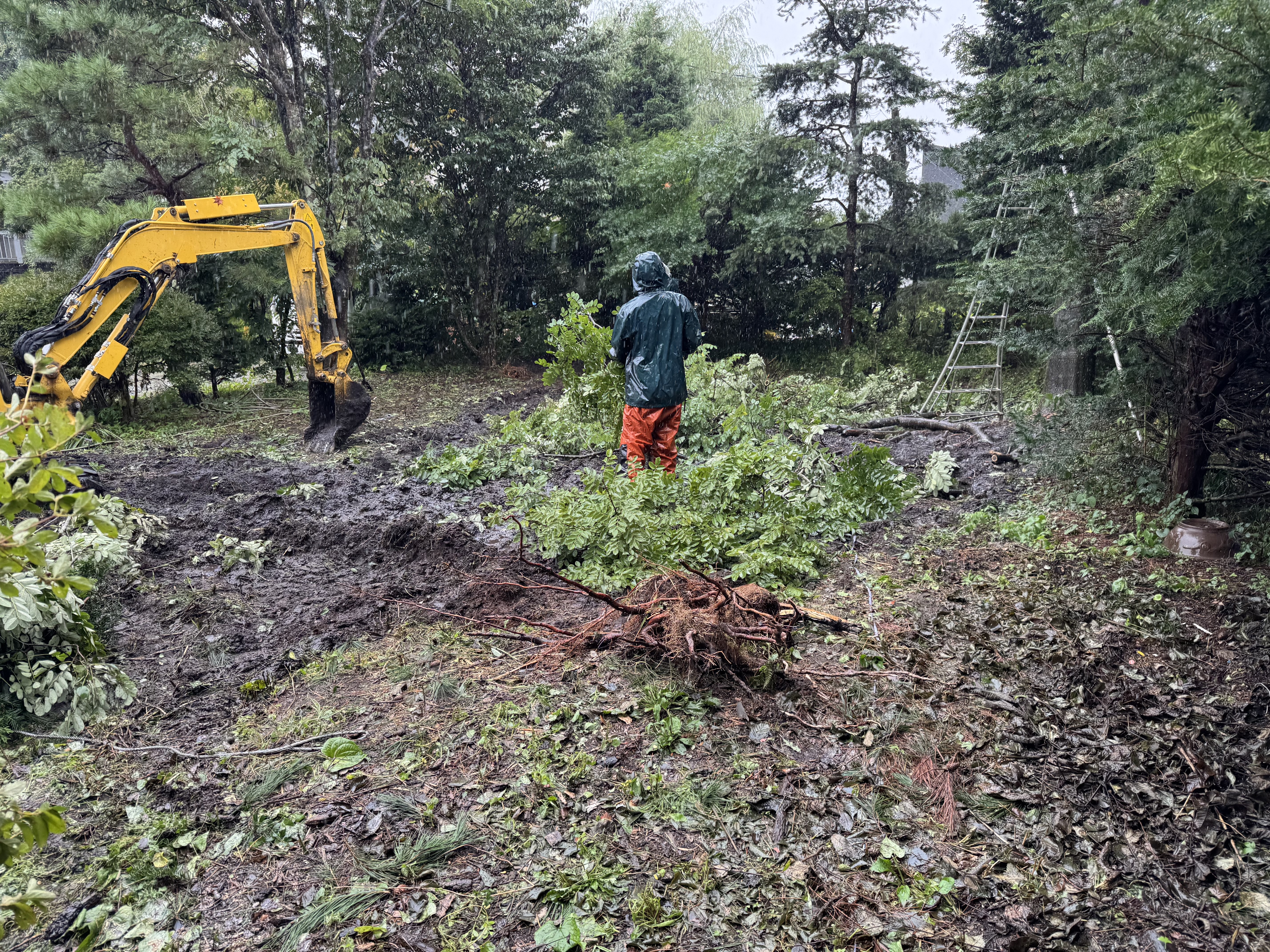 エンジュ2本枝払い。モミジ、ツツジ2本移植、イチイ2本、置場に借り植え、枝ゴミ1台処理場に運搬、根1m3置場に仮置き