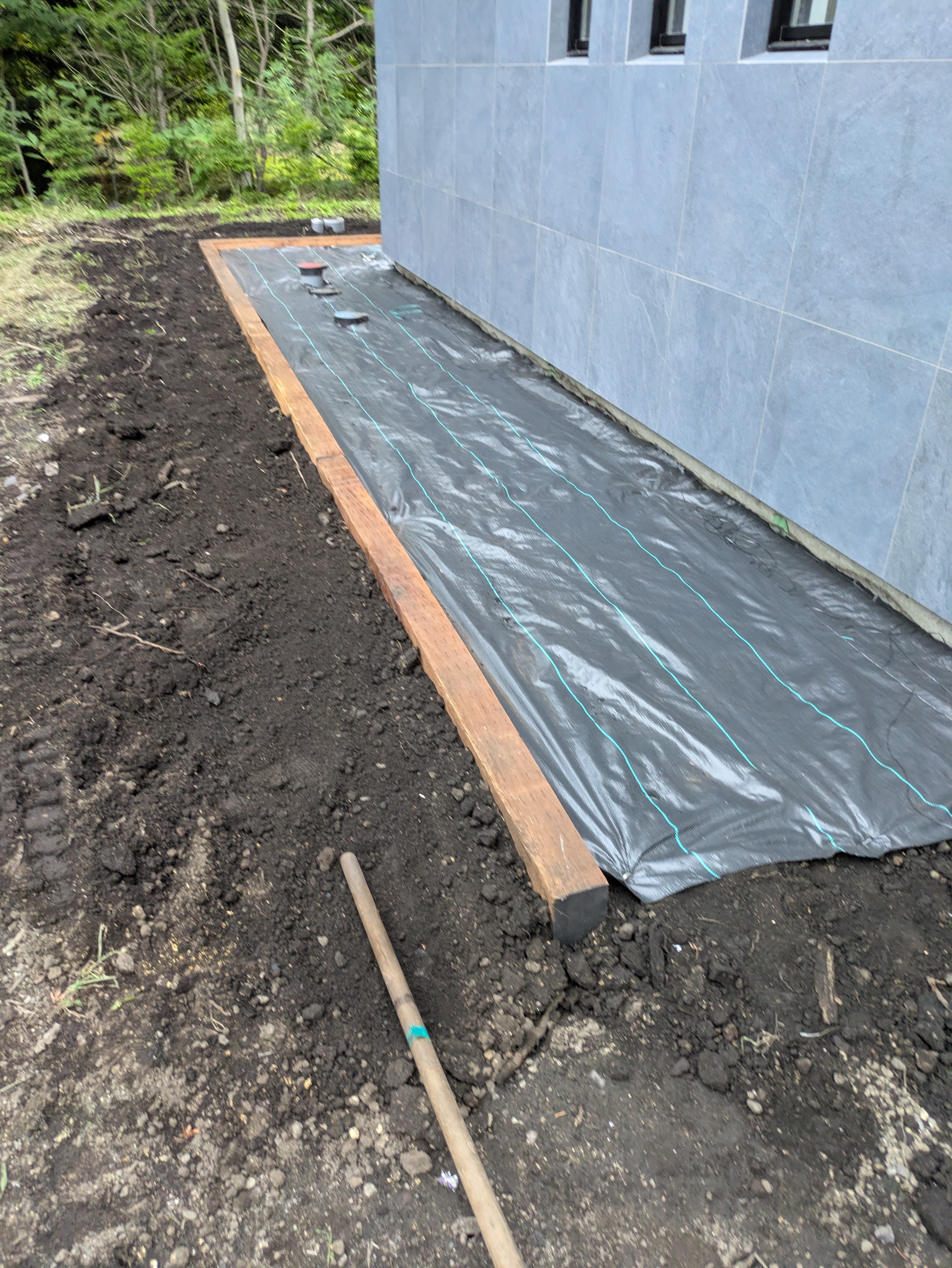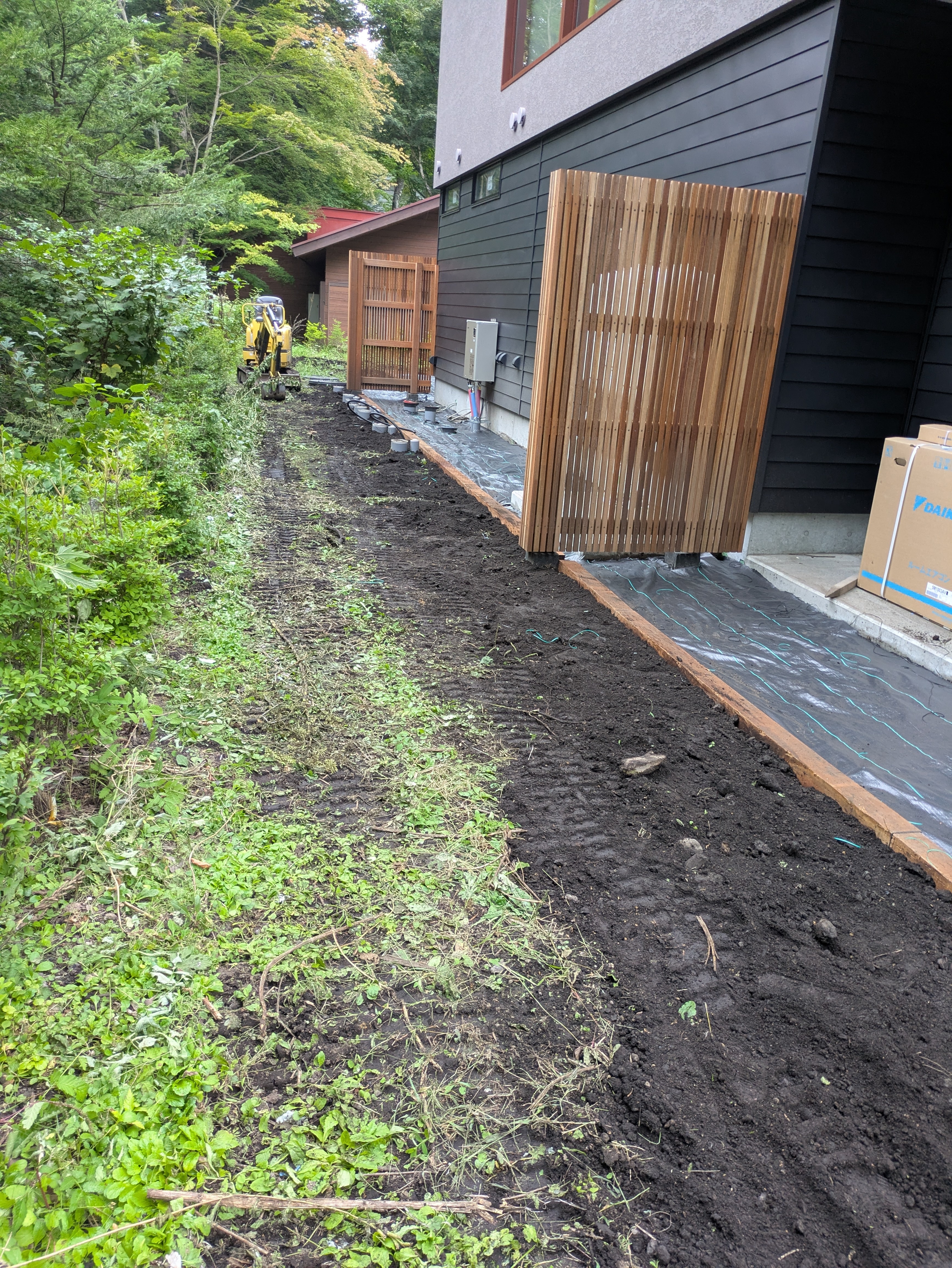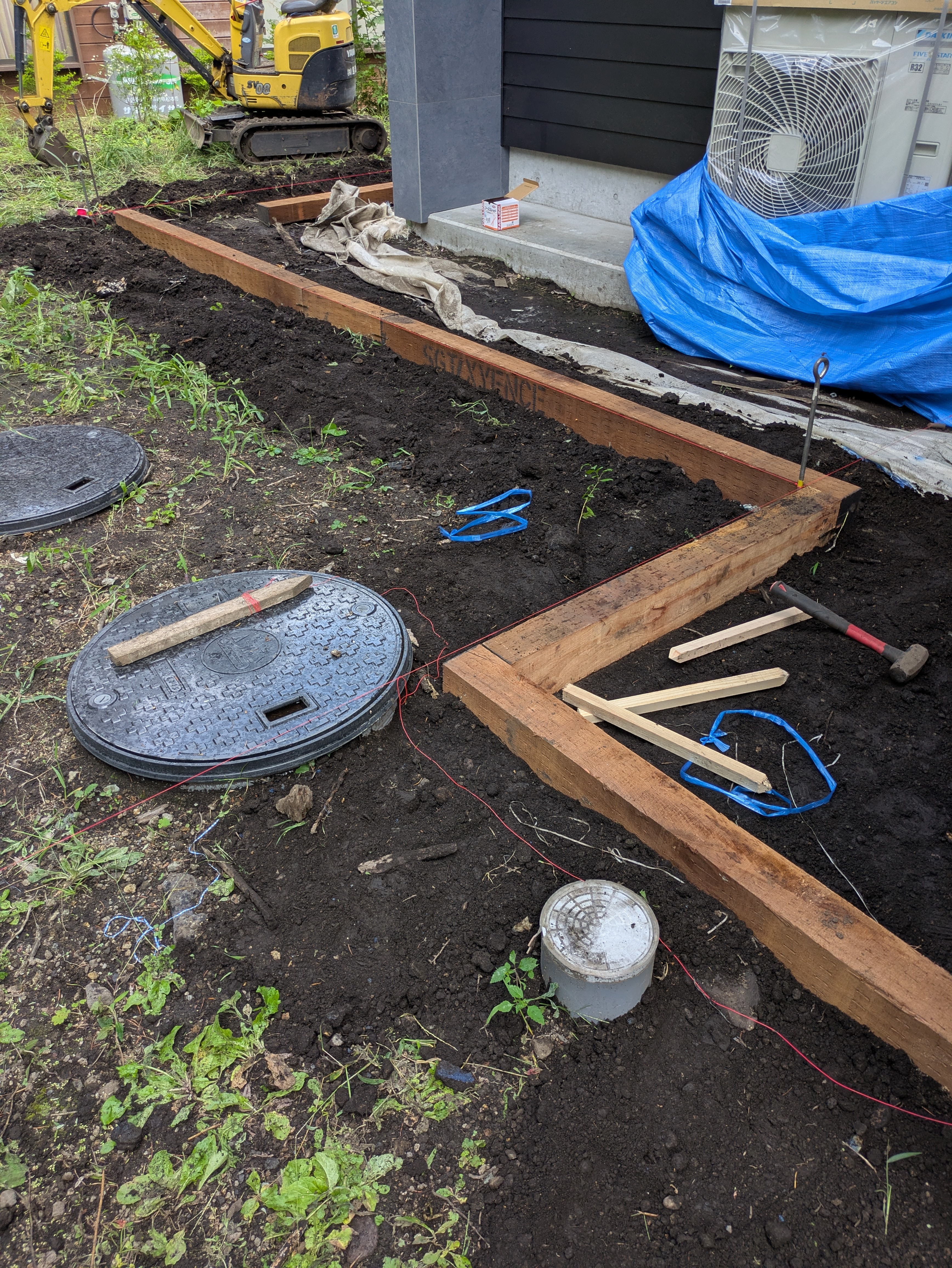 雨落ちの枕木布せ 加工 枕木39m並べて完了