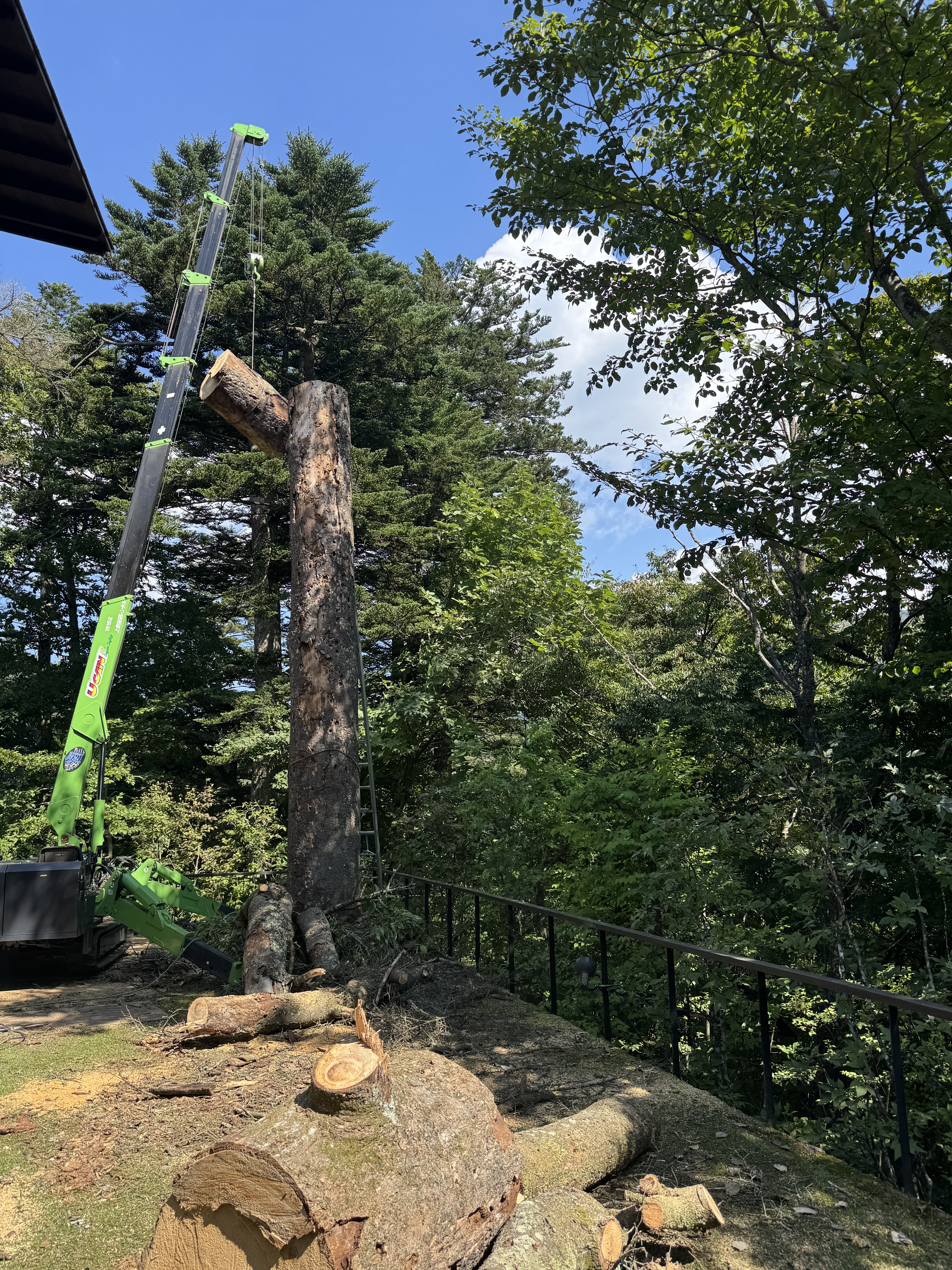 8時から17時、EQC様邸、花、植栽、昨日の続きの幹を伐採、枯木の枝払いと枯木2本をワイヤーで引っ張って倒しました。