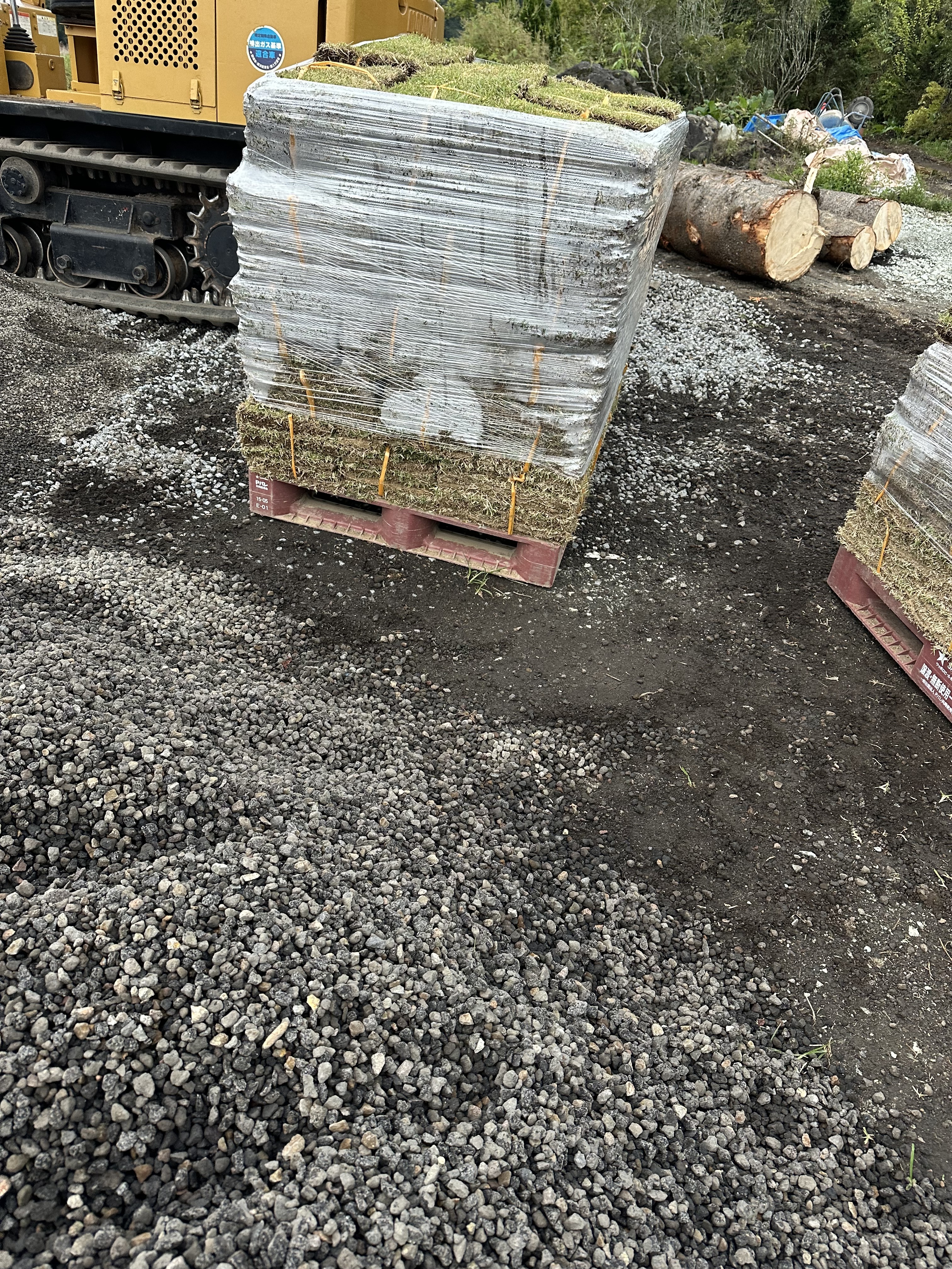 お疲れ様です。 本日の作業 7時30分 会社の置き場でトラックから 芝7パレット350束 クローラーフォークリフトで卸す。