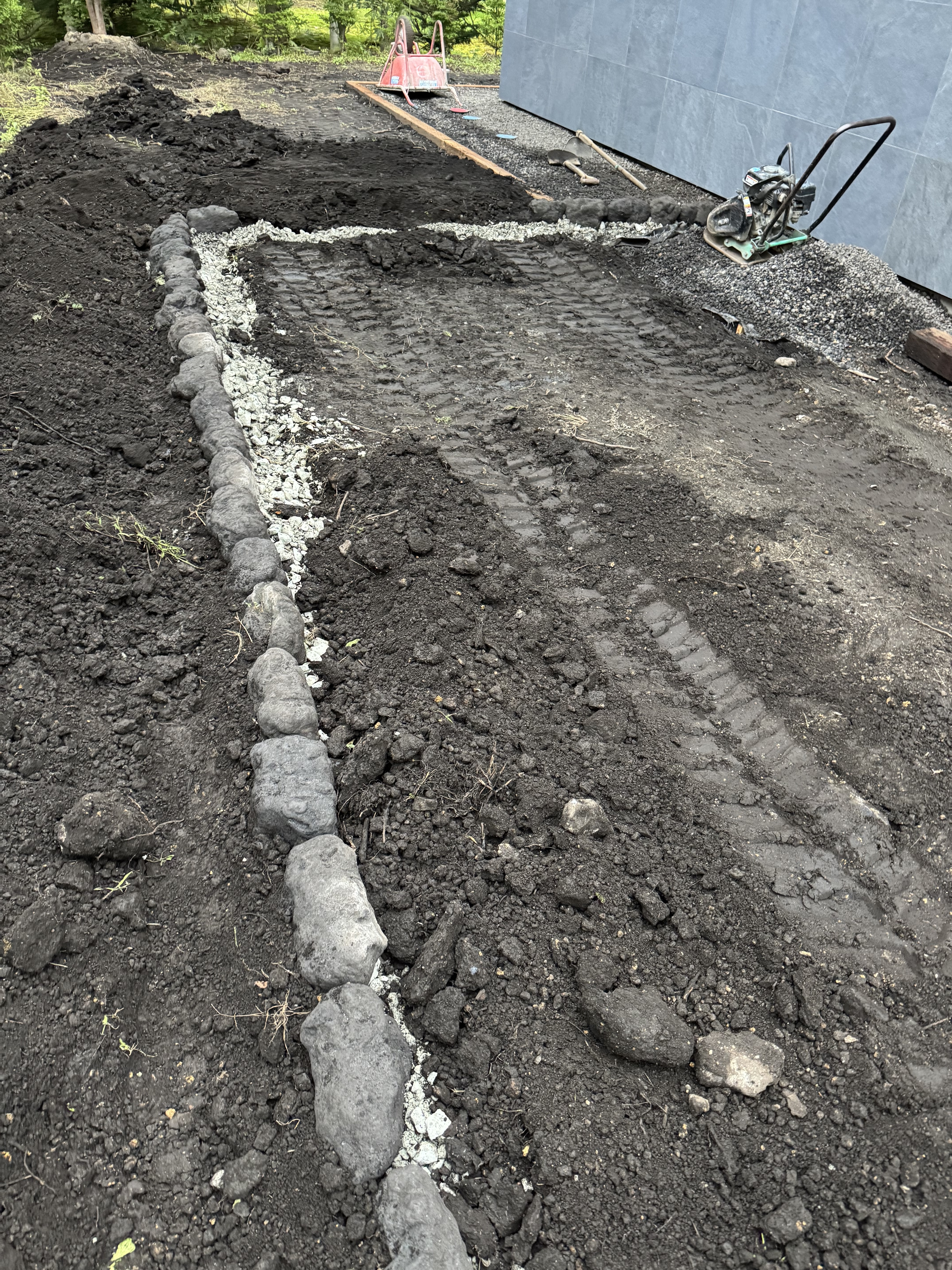 7時30分から17時30分、CKN様邸、アスファルトの縁取りの縁石積みの掘削、砕石入れ、転圧、縁石ならべ、約23m