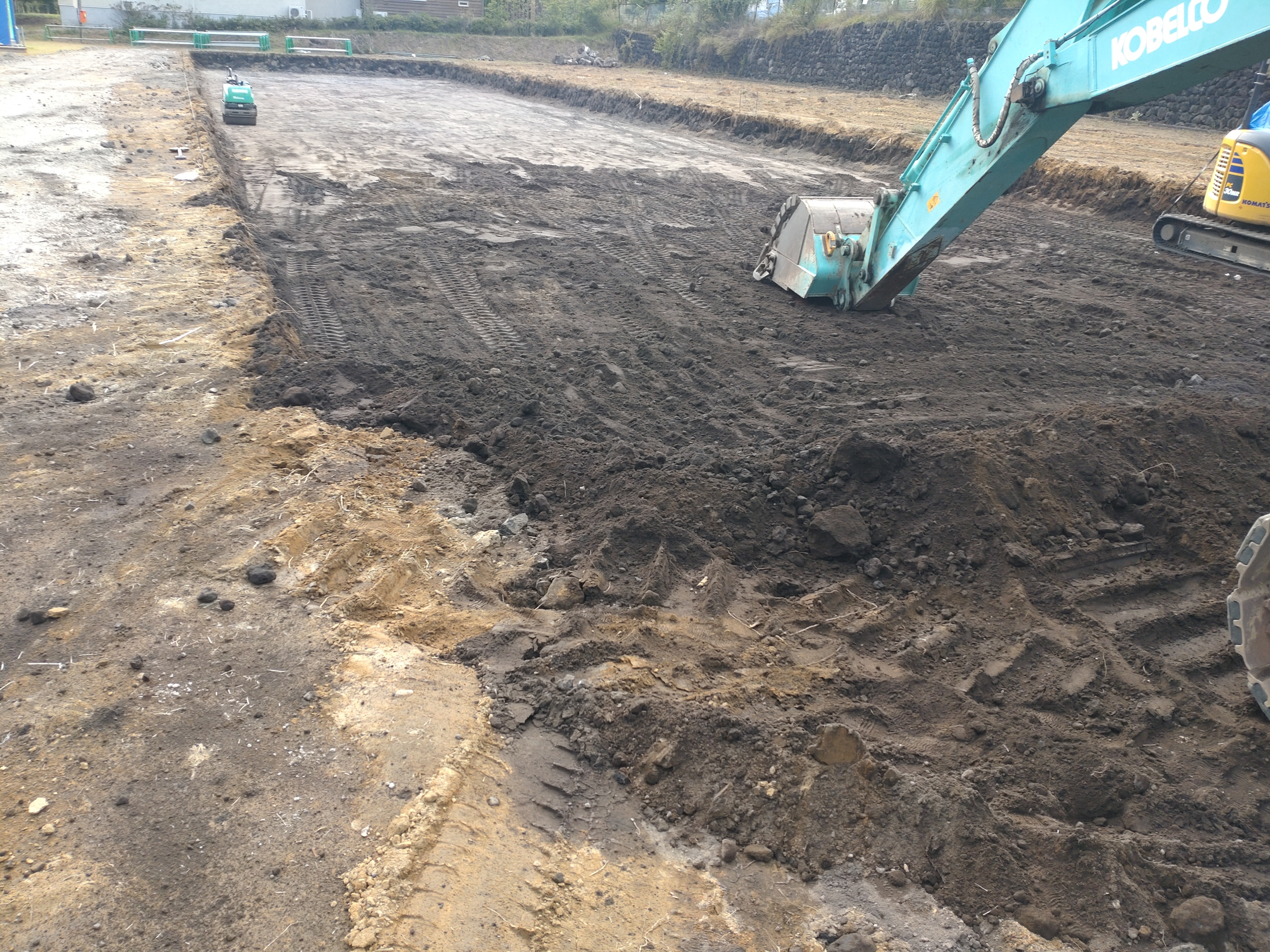 bowさんが大型バックホーで床掘り、残土出したあとバックホーとオートレベルで深さ調整、仕上げ、ローラーで転圧です。