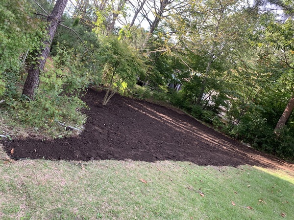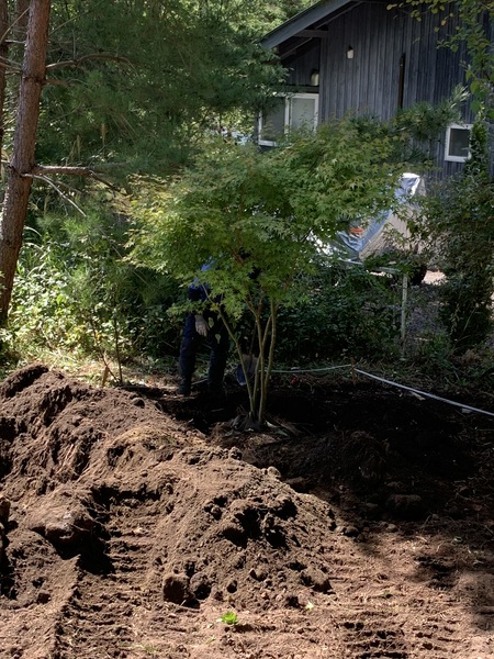 監督と打ち合わせ芝の範囲を決めてもらう、芝養生、芝下地作り(草刈り、表土はぎ、黒土搬入、整地)、リース屋さんからクローラーダンプ搬入、表土と草2台置き場へ運搬、資材屋さんから黒土2台搬入、モミジ1本移植、芝はぎ