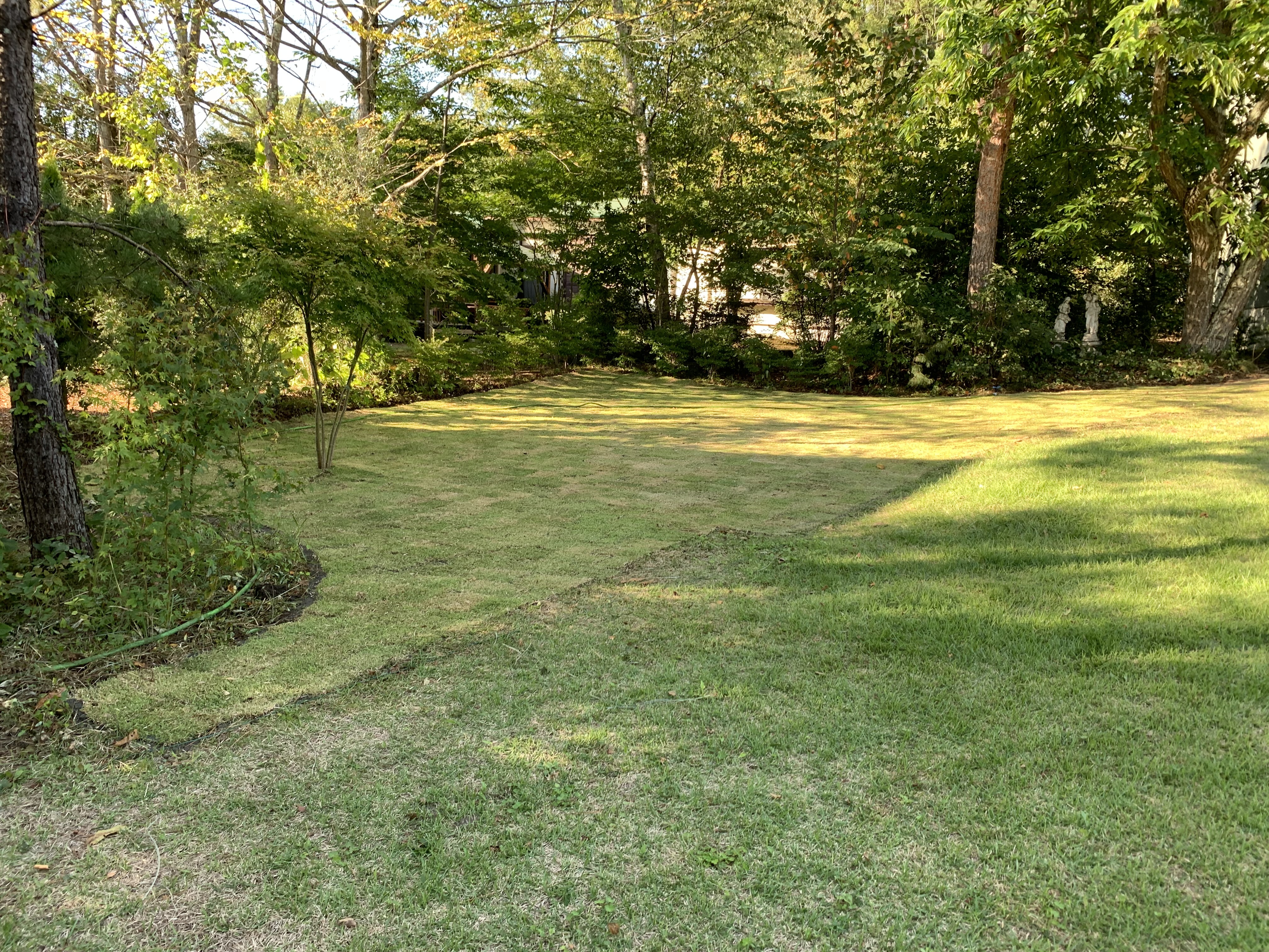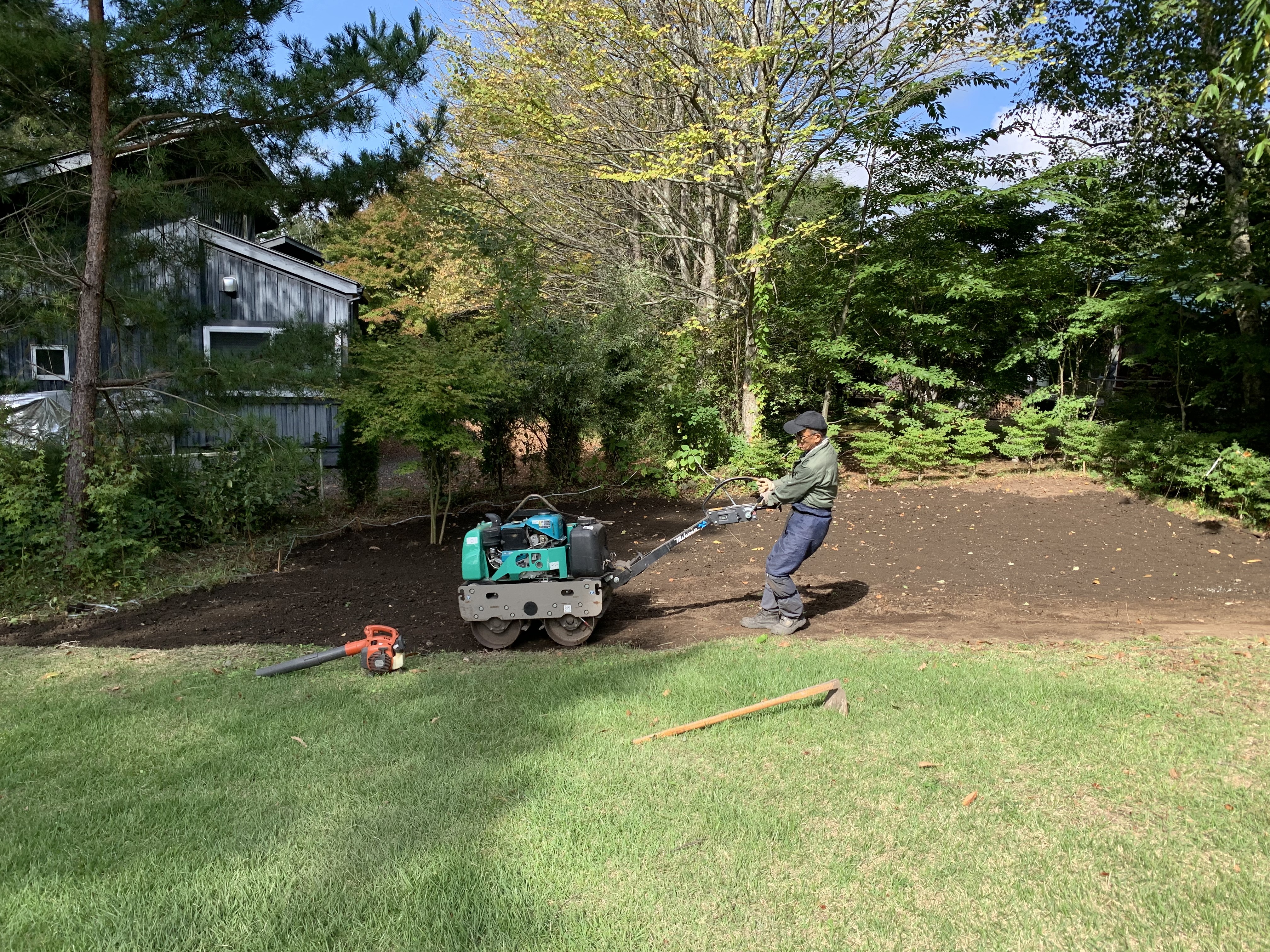 枝払い、黒土入れ(置き場から黒土0.5立米搬入、敷き均し、転圧)、芝ライン出し、ローラー搬入