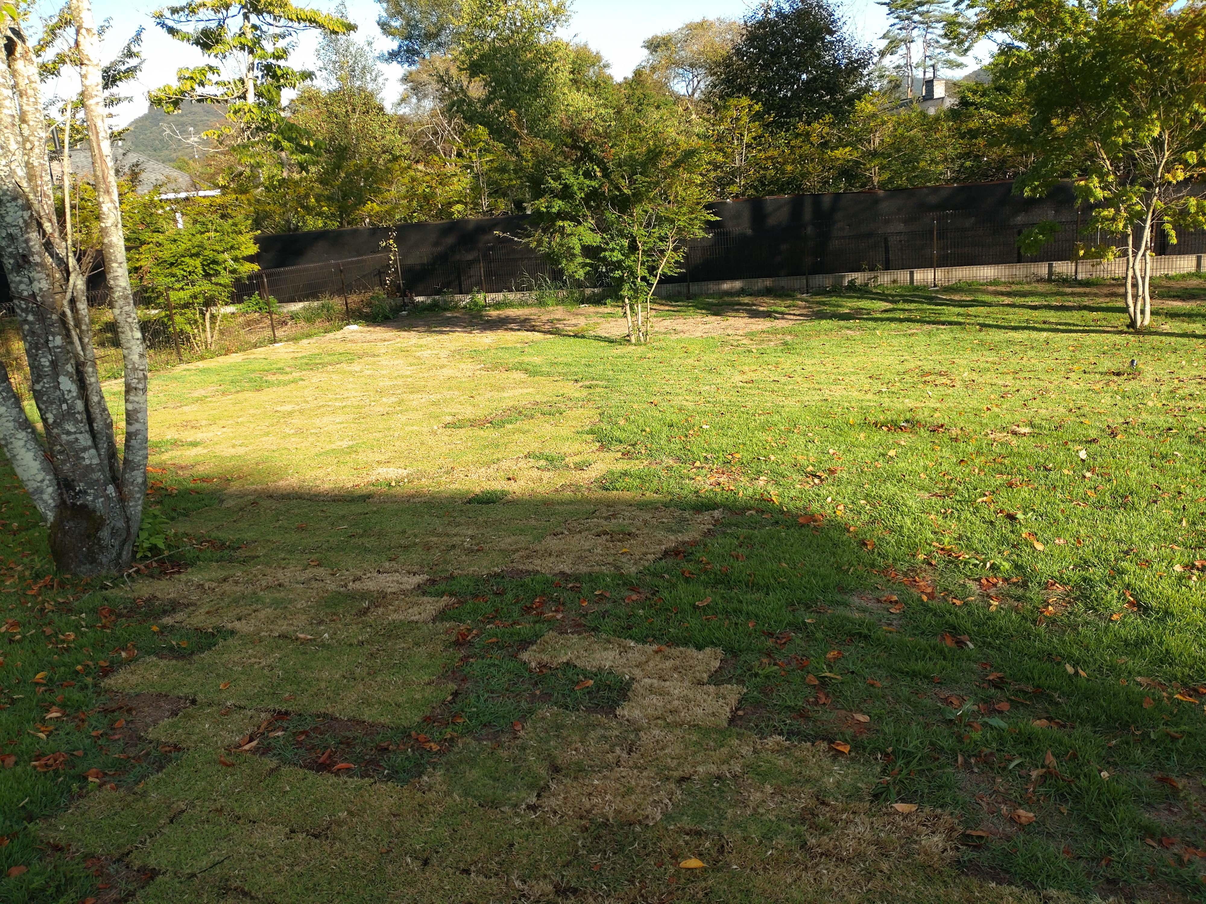 枯れた芝剥ぎ、YAMさんが持って行った芝12束芝張り(yos君が30束先に持って行き合計42束使用)、水やり