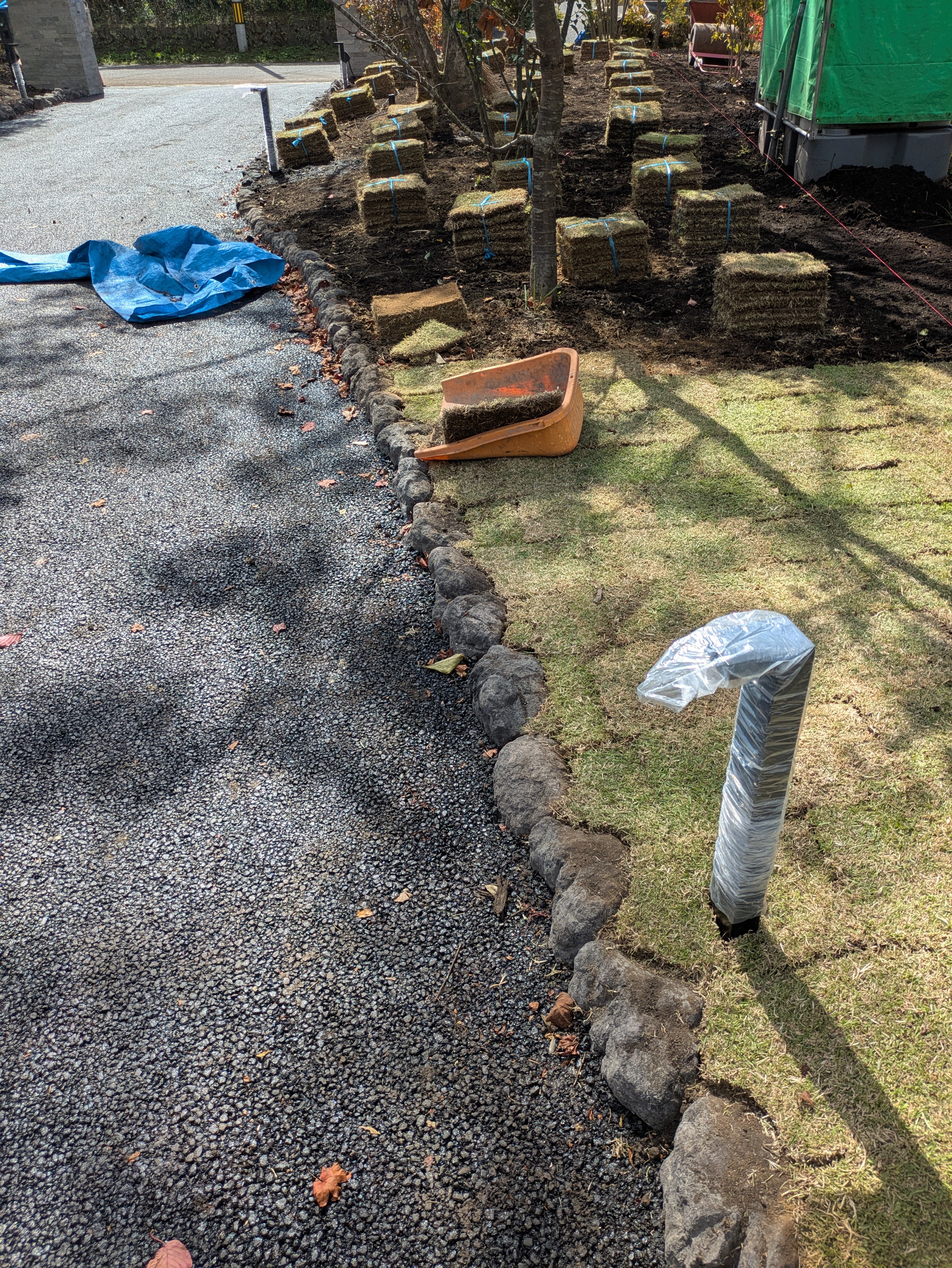 芝張り 途中 自社資材置き場から、浅間石70cmサイズ他1台運搬