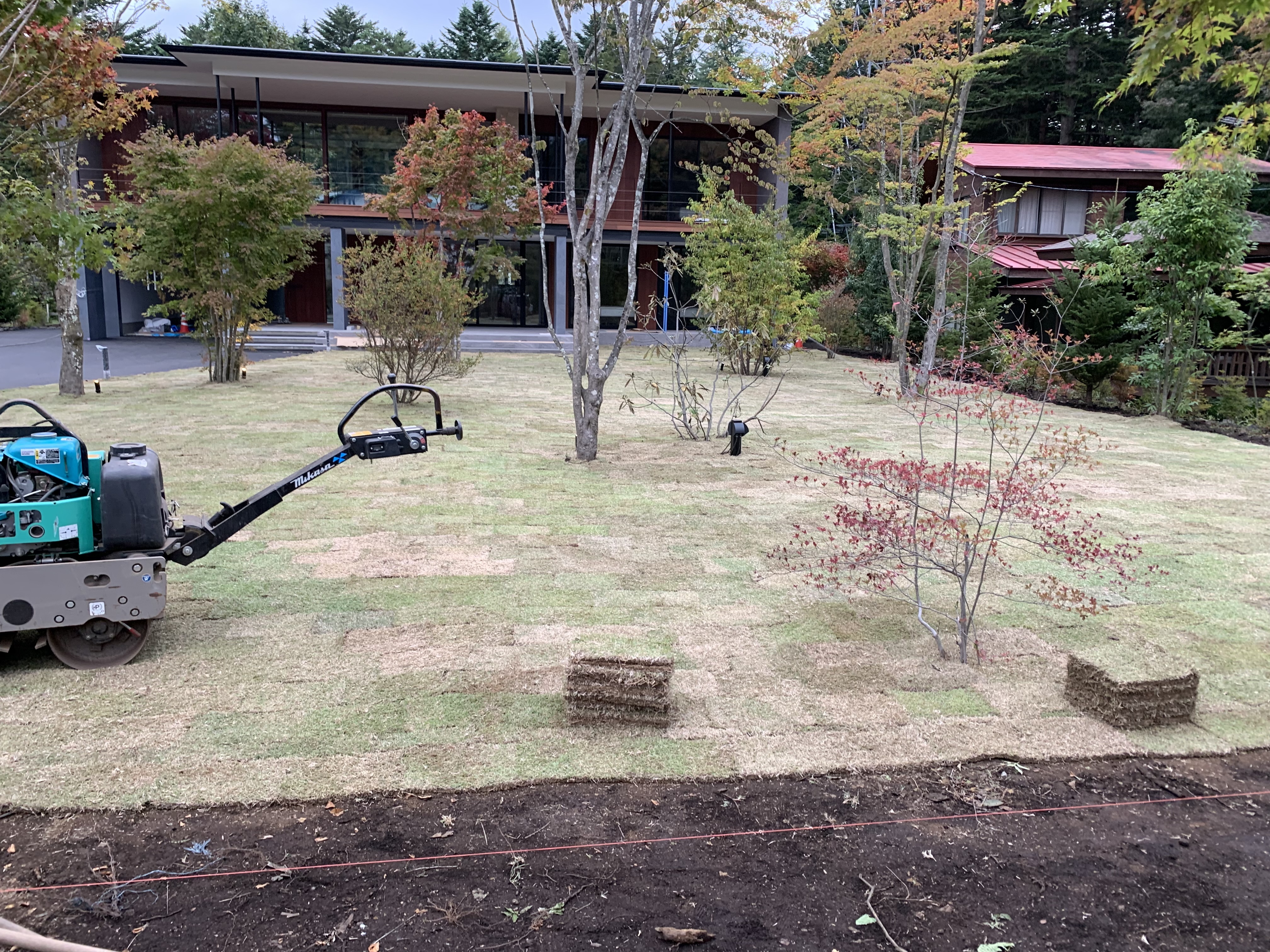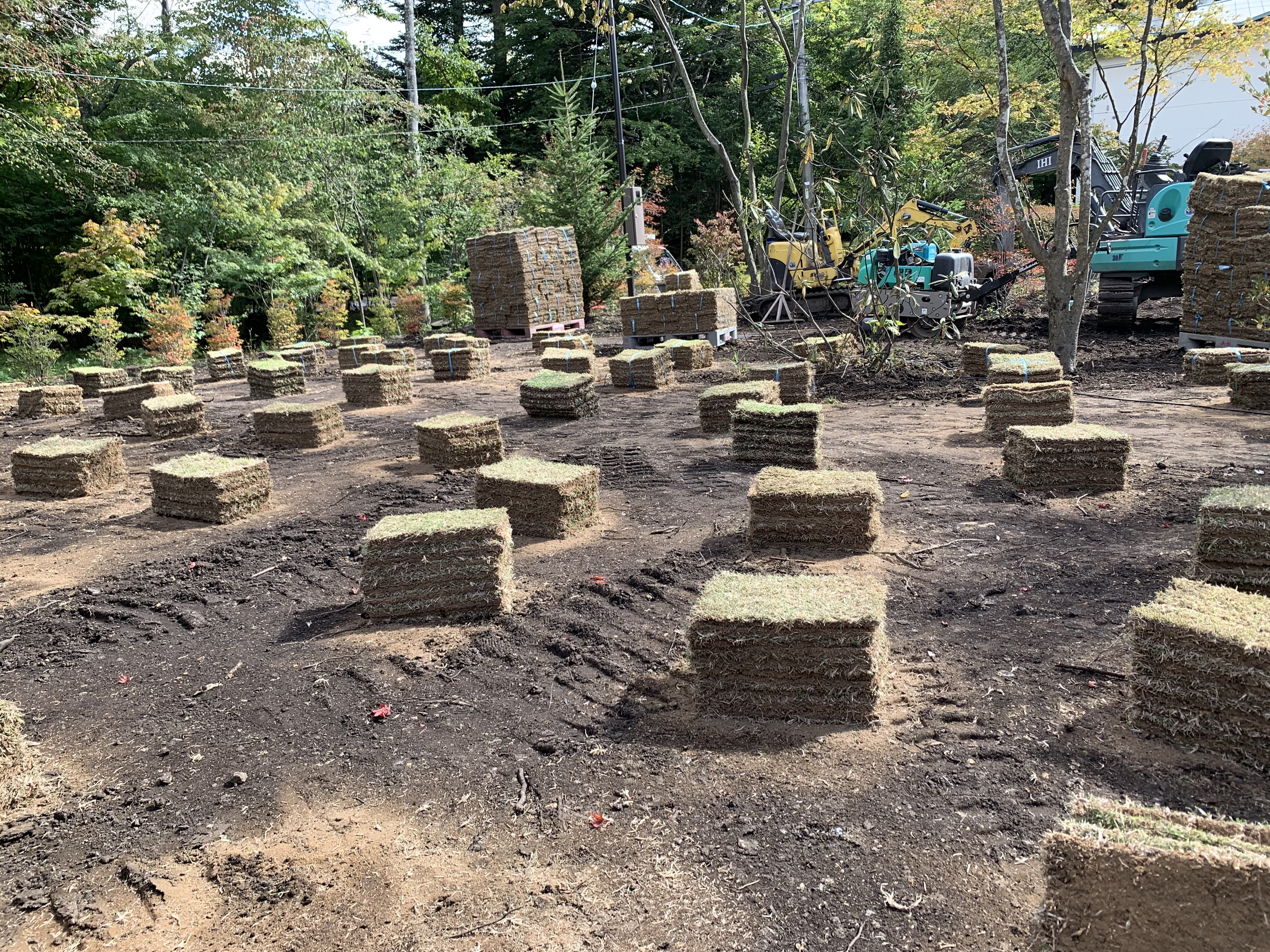 朝、ユンボ1台置き場へ運搬、置き場のパレットを積んで現場へ運搬、芝下地作り、植栽(ドウダン、ミツバツツジ、シラカシ)、ローラーかけ、芝張り(432束使用)、水やり、石積み、整地、最後に社長と明日の現場の下見、打ち合わせ