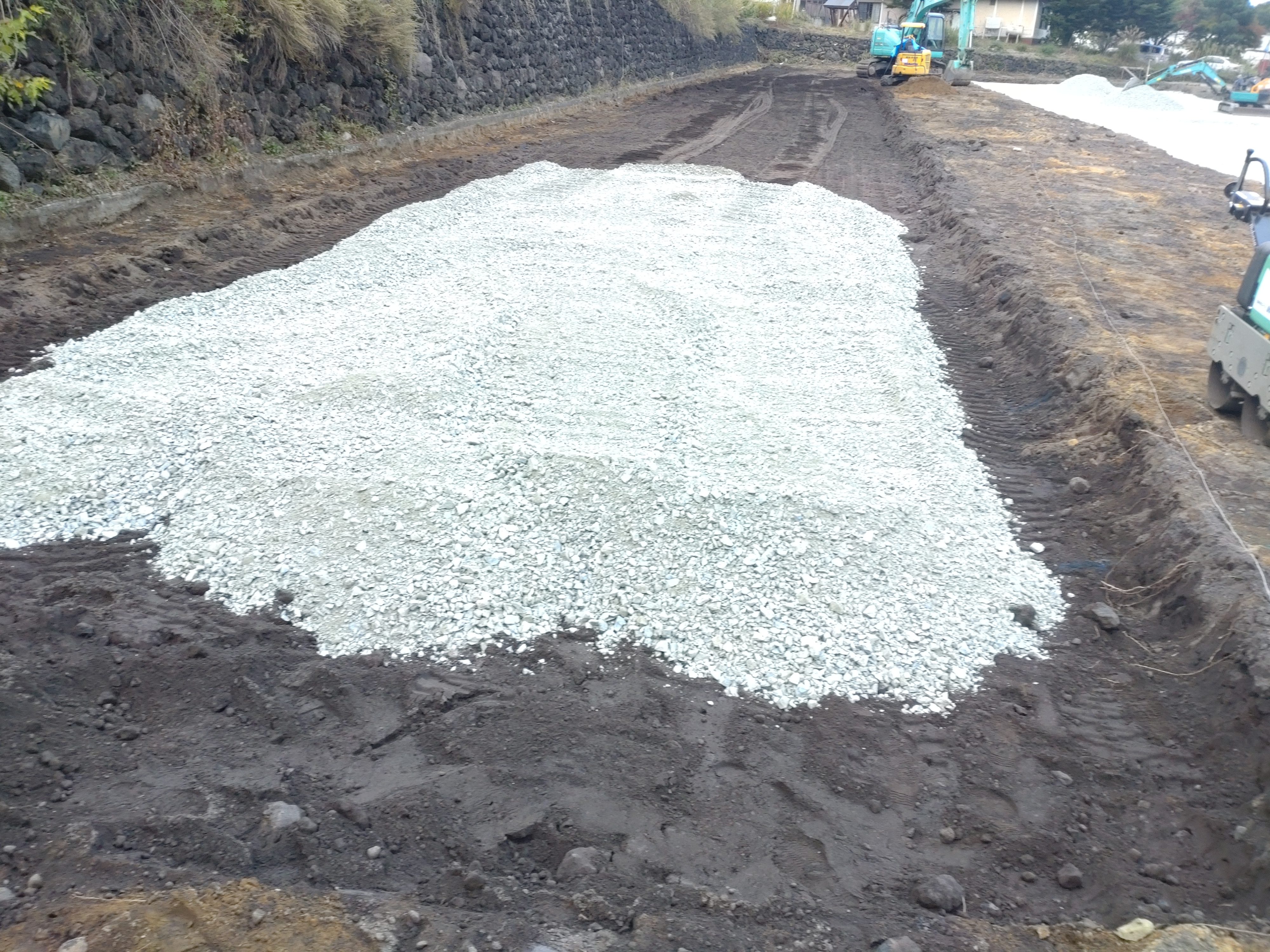 大型バックホーで表土の黄色い土の残土出し(大型ダンプ2台まわり)オートレベルで高さをみながら北側道路箇所の掘削、また低いところの土盛りをして路盤工を行いました。