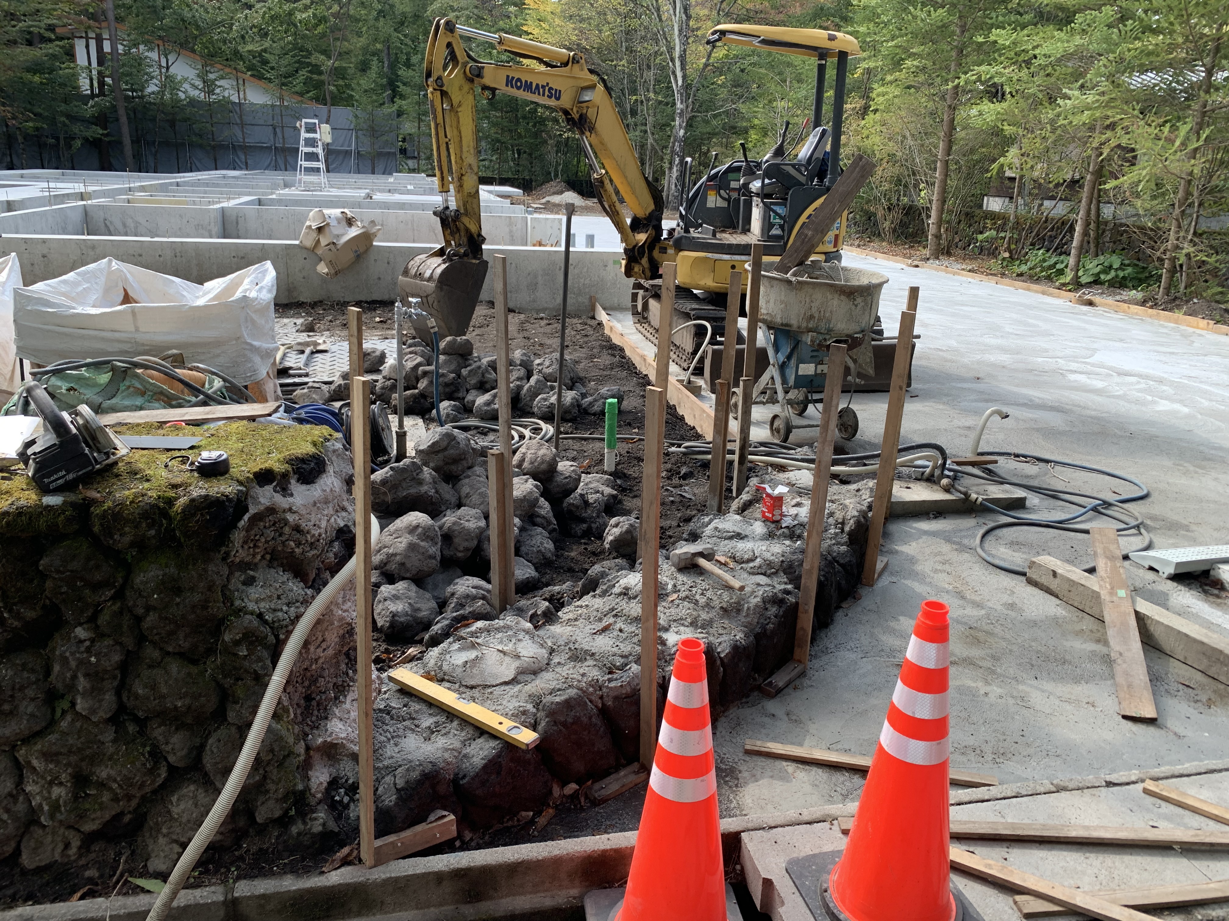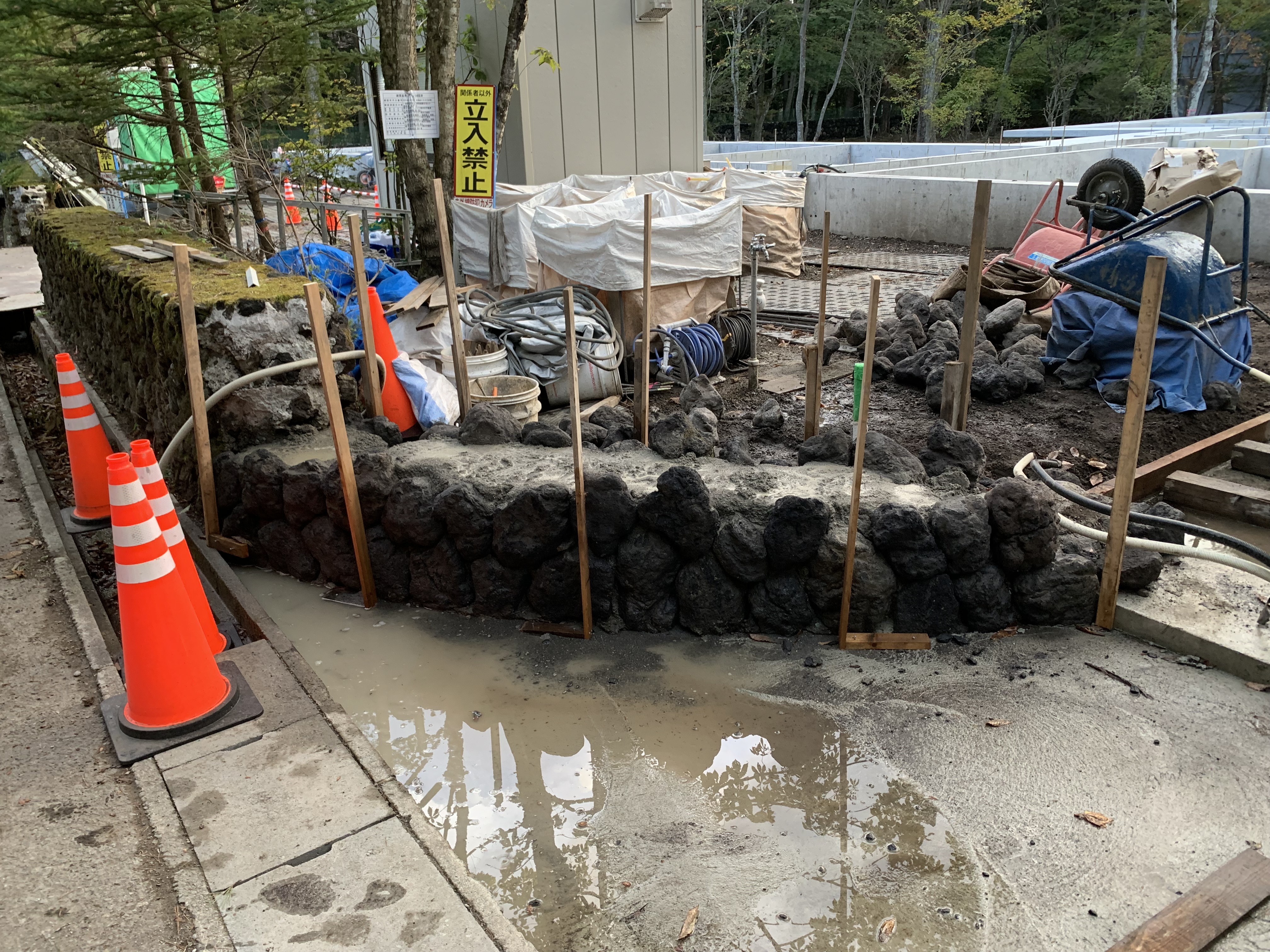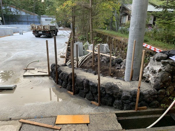 朝、資材を積み込み現場へ、監督と打ち合わせ、資材を降ろして置き場からユンボ運搬、丁張り出し、置き場から浅間石運搬、石積み(両岸1段)、資材屋さんから砂0.5立米運搬、モルタル打設、洗い