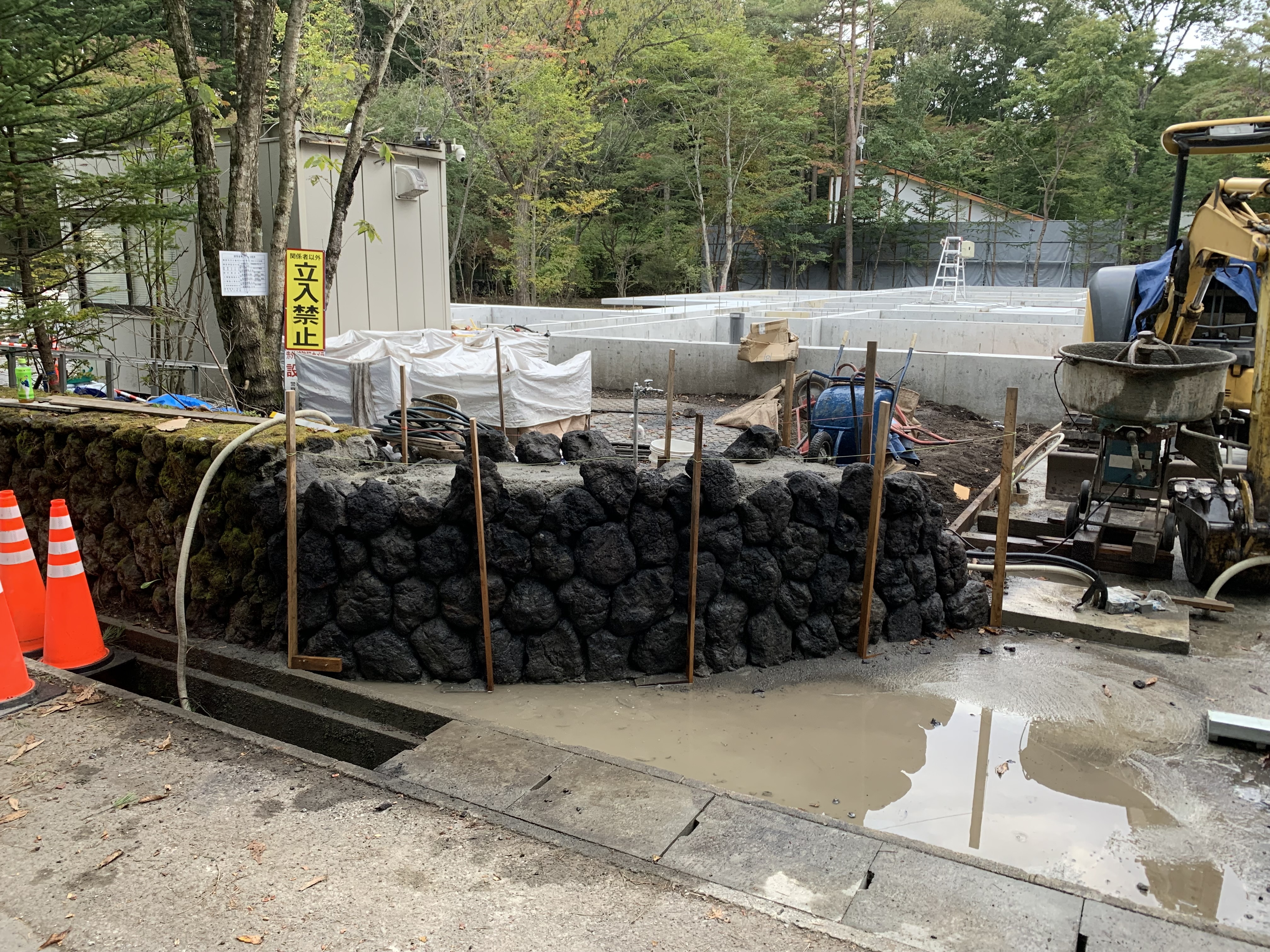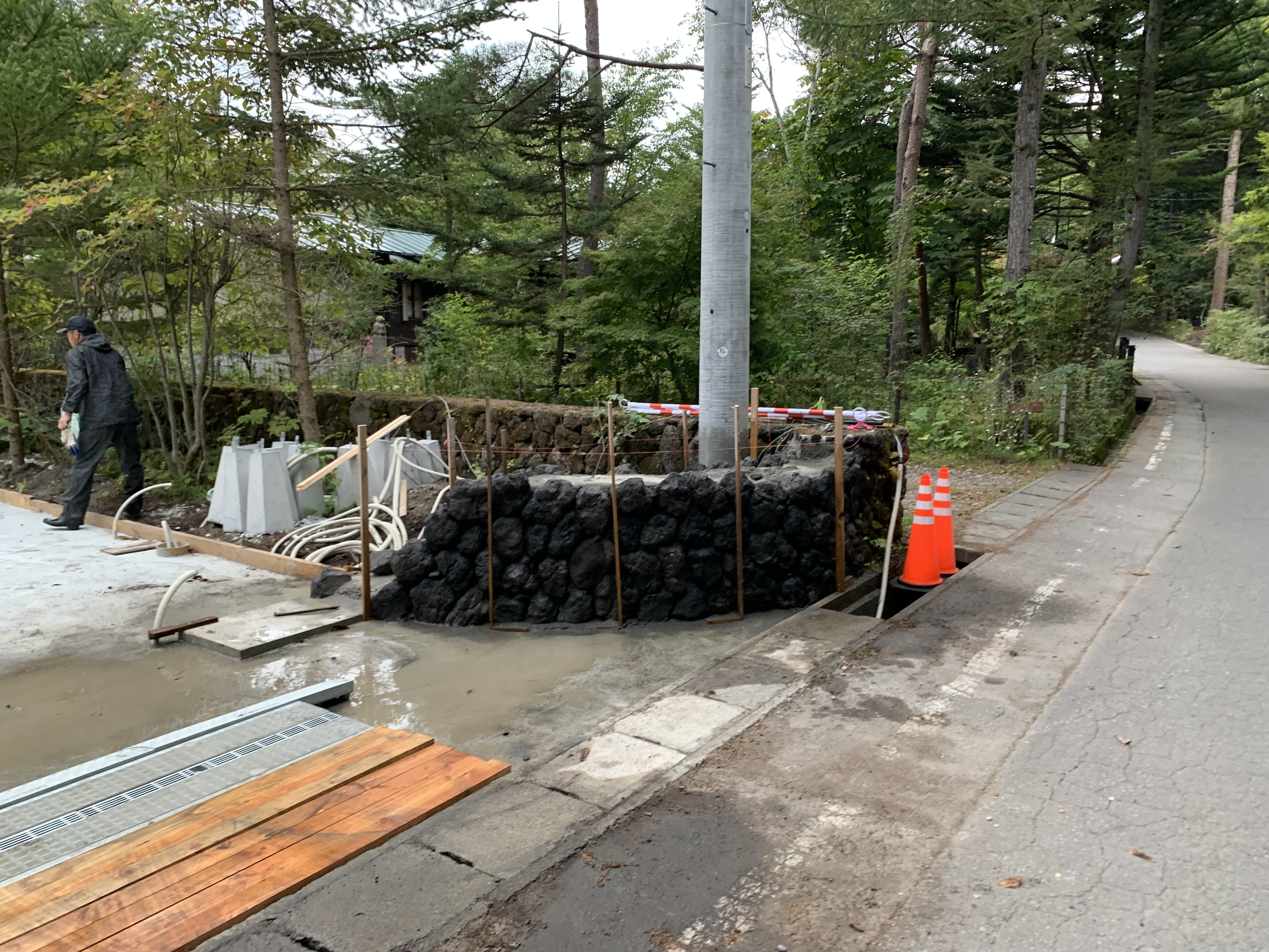 朝、置き場から浅間石100個拾い出し現場へ運搬、石積み(両岸2段完了)