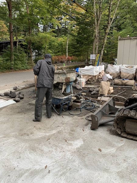ダンプ、ユンボ、ミキサー、バイブ使用