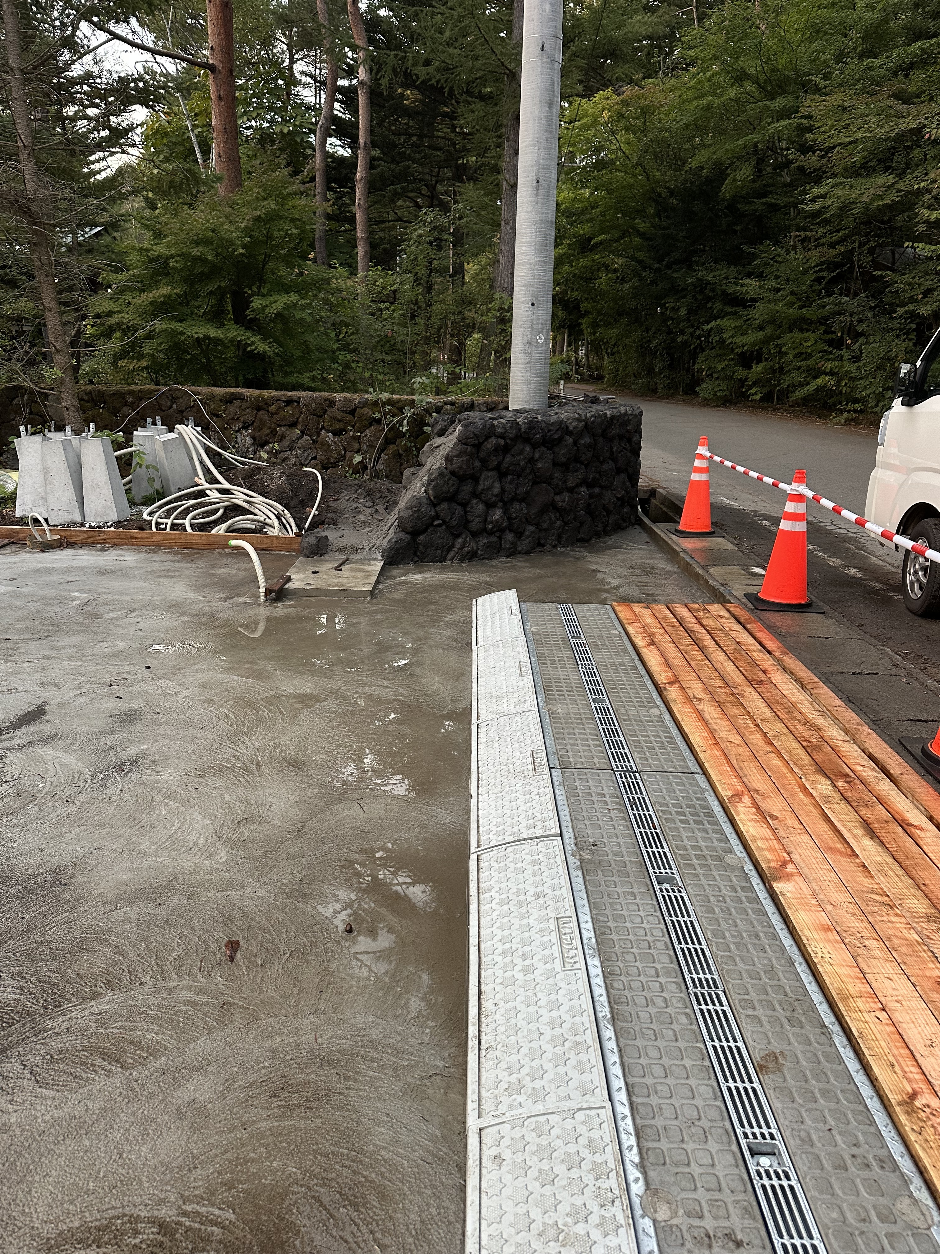 現場へ戻り 構内 道路などスコップと水で洗浄。