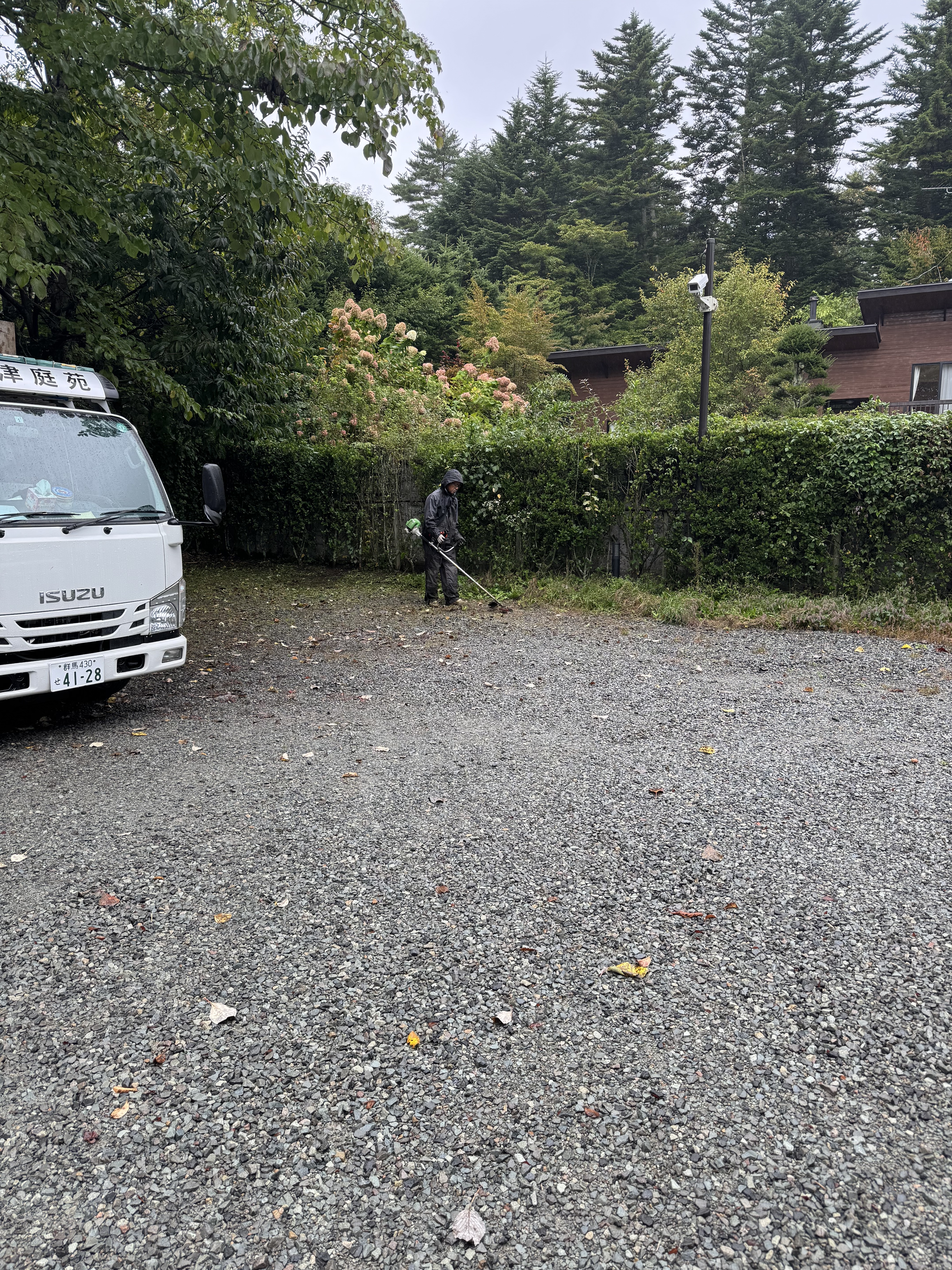 8時10分から16時30分、MZマンション様.草刈り、肥料やり(化成肥料40キロ)人員6人、使用機械、ダンプ2台、草刈り機、ブロアー