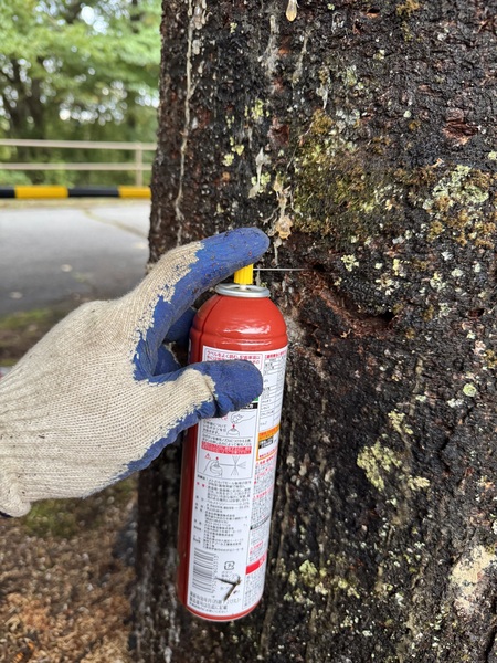 理事長に言われたテッポウムシの穴は殺虫剤のスプレーしてからカルスメイトで埋めました。野口さんにタイヤショベルでゴミを突いてもらいました。明日もGNマンション様です。