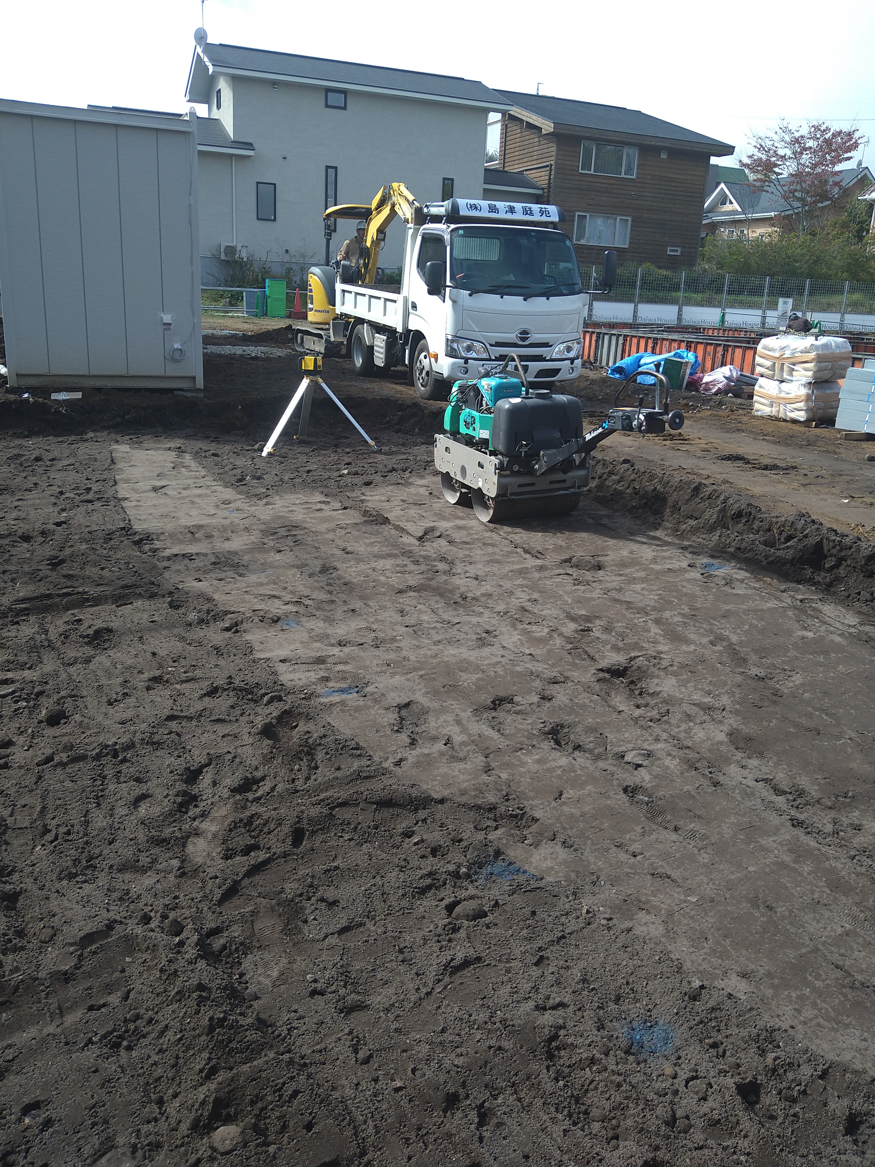 7時半から、道路部分の通りを境界杭から追い出し、マーキングしました!床掘りの深さをレーザーセットし、盛土部が無いか確認し、低い箇所でもほぼレベルだったので、床掘りと残土搬出を始めました!