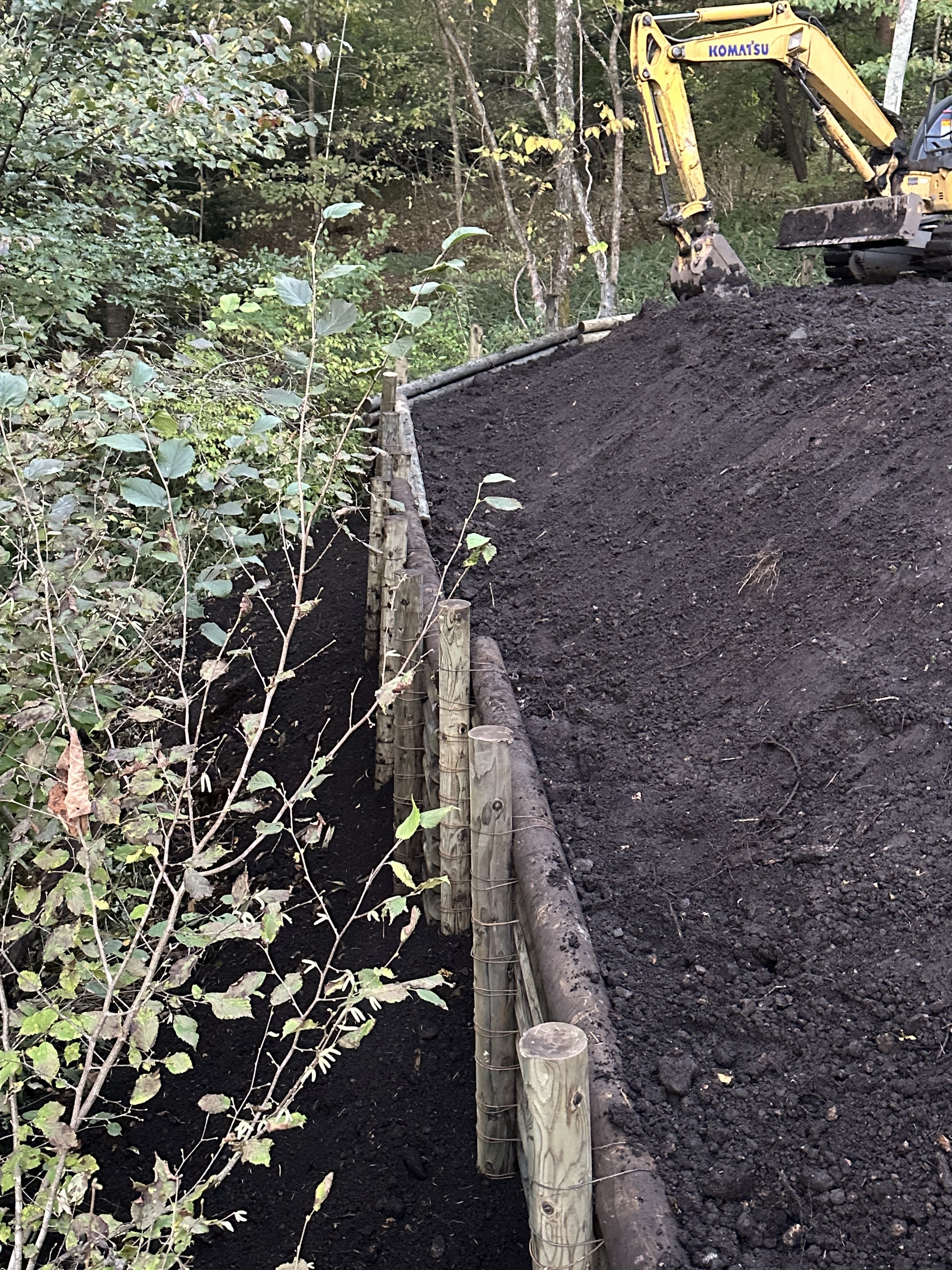 お疲れ様です。 本日の作業 SWB様邸 7時30分から17時00分 人員3名 土留めの土の掘削補助 ユンボでの杭打ち込み 丸太設置作業 結束 土埋め戻し 土留めの外側整地