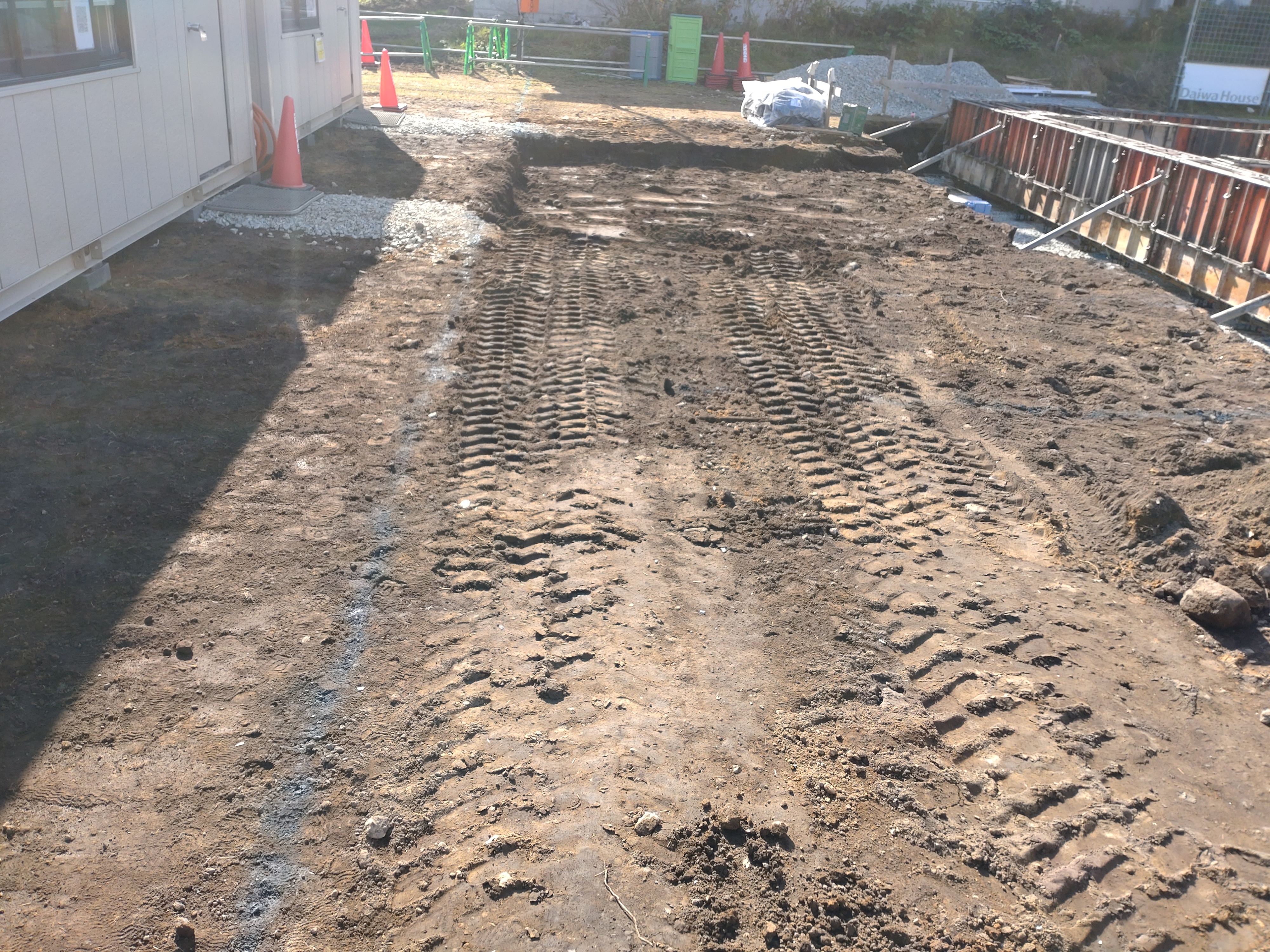 南側の駐輪場の掘削3トンダンプに残土積み込み(型枠支保工の関係で1箇所のみ掘削)