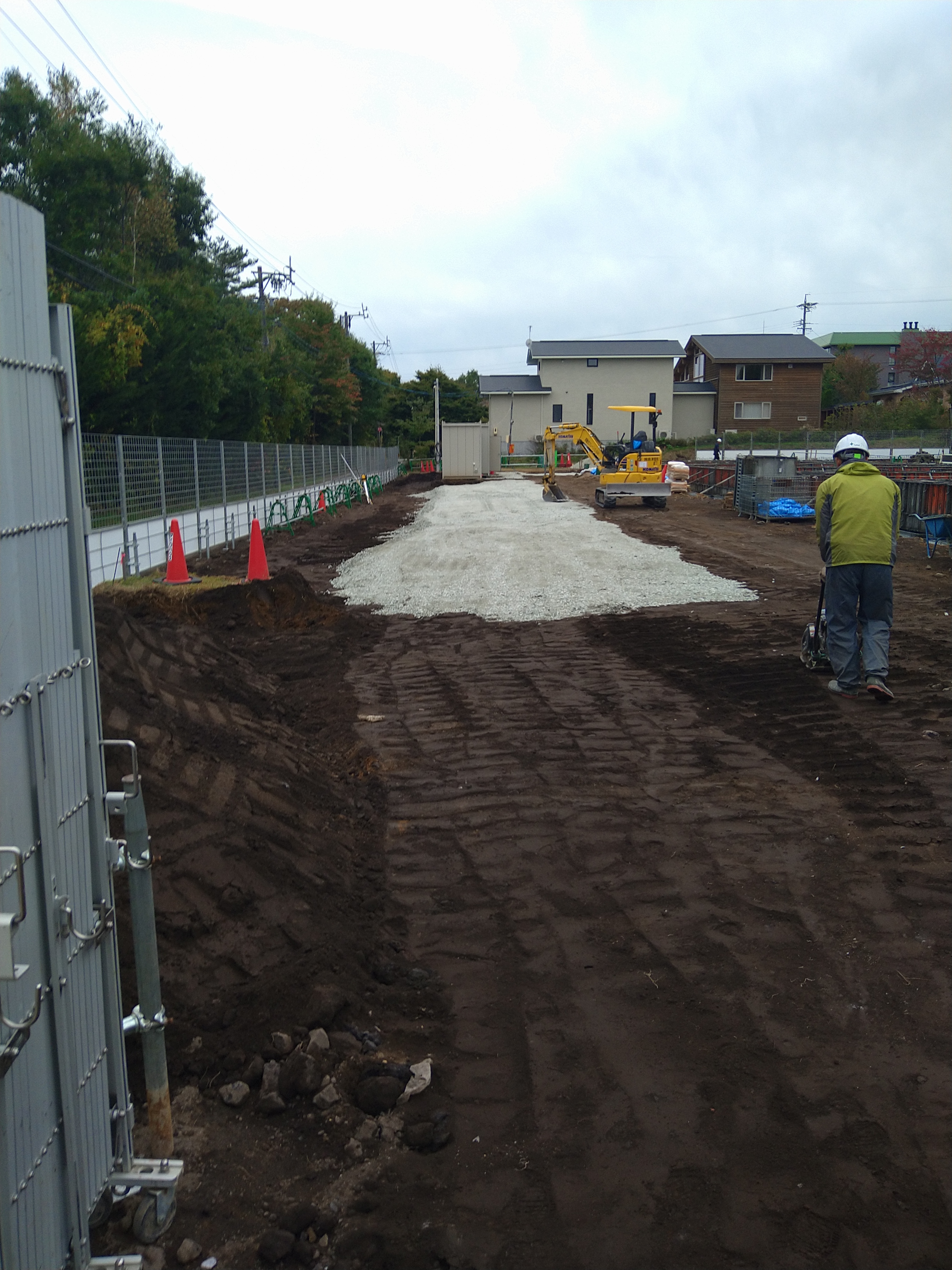 道路部分の床掘りをし、残土をストックし、境界の杭が建物基礎が終わるまで移動出来ないのでキリの良いとこまで砕石を敷均しをし、残土を搬出しました!