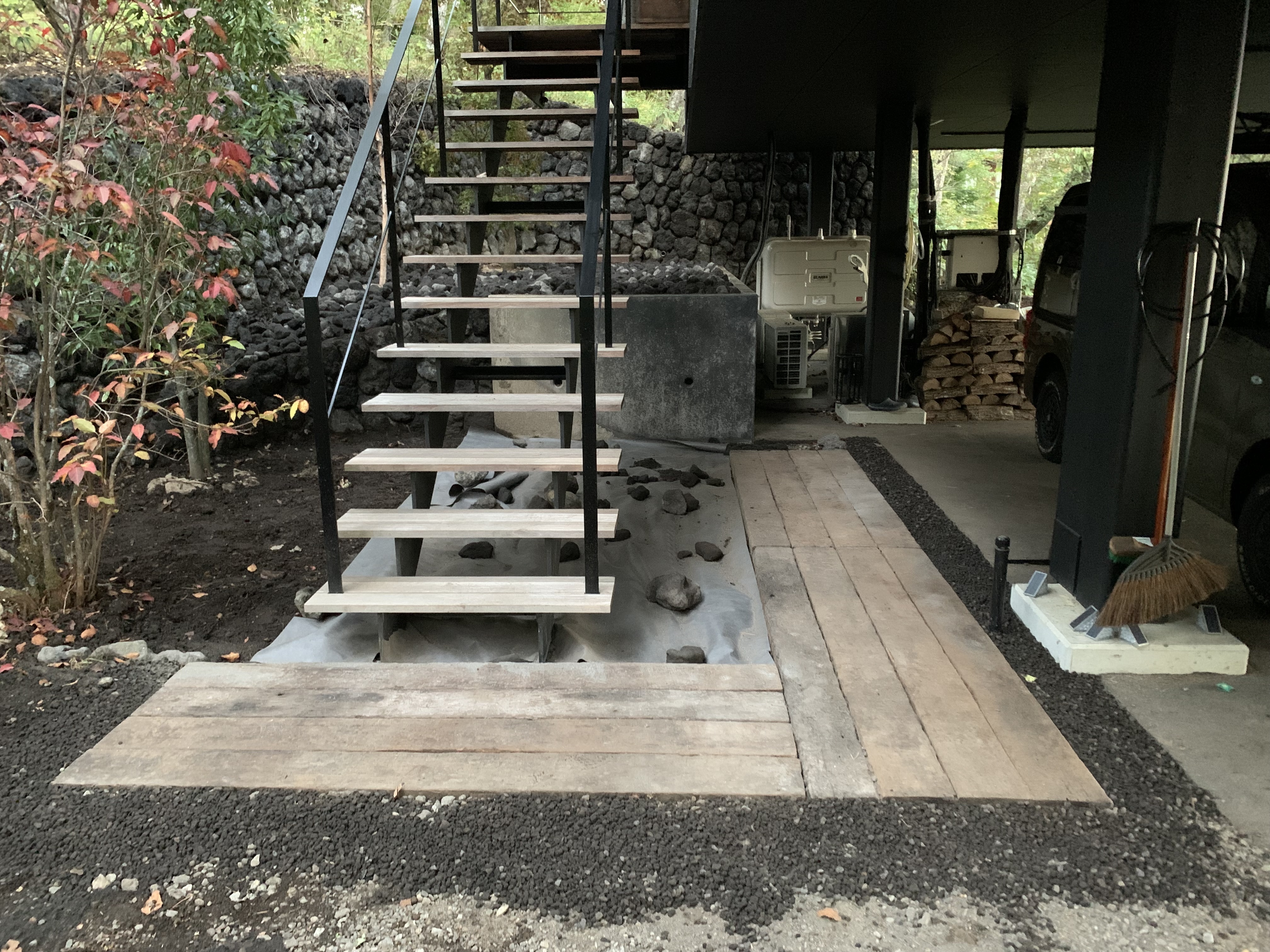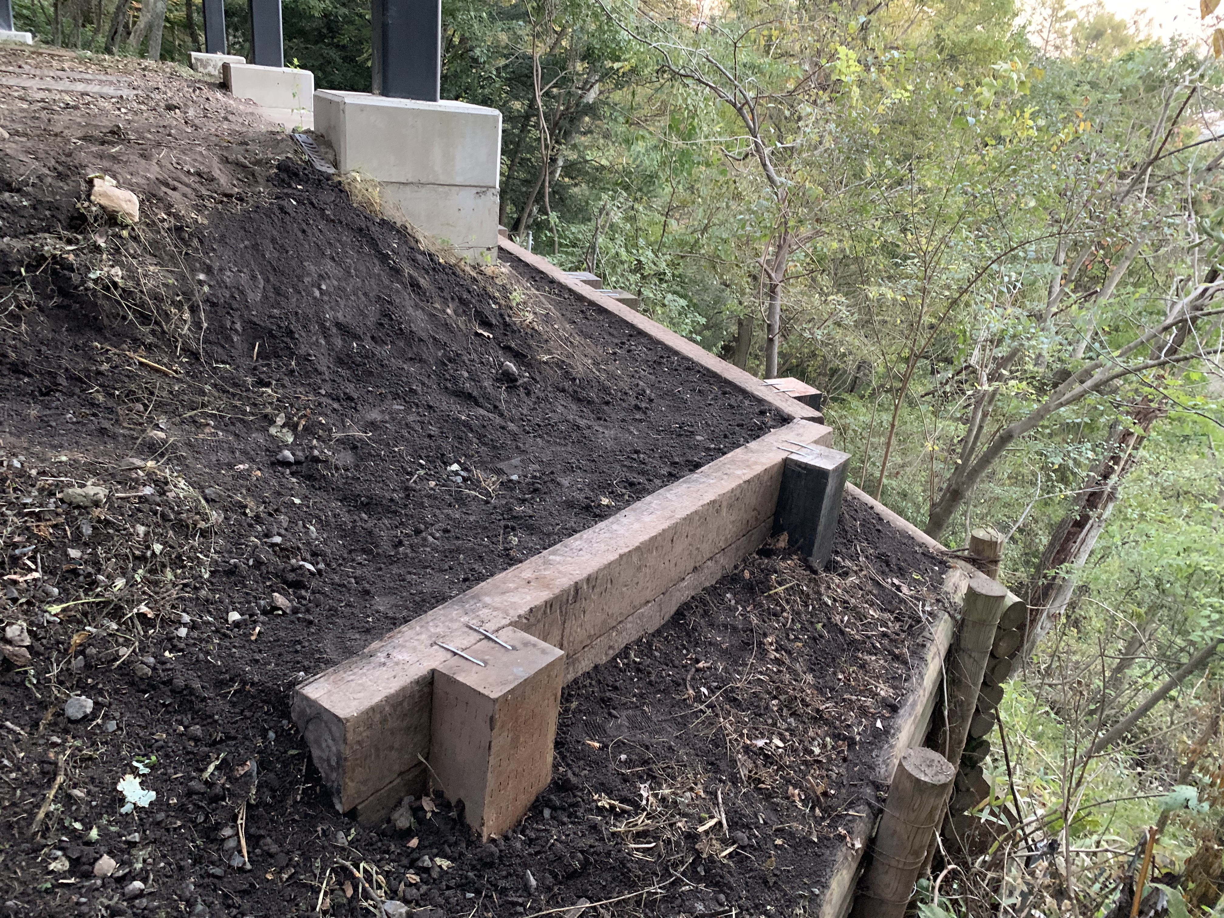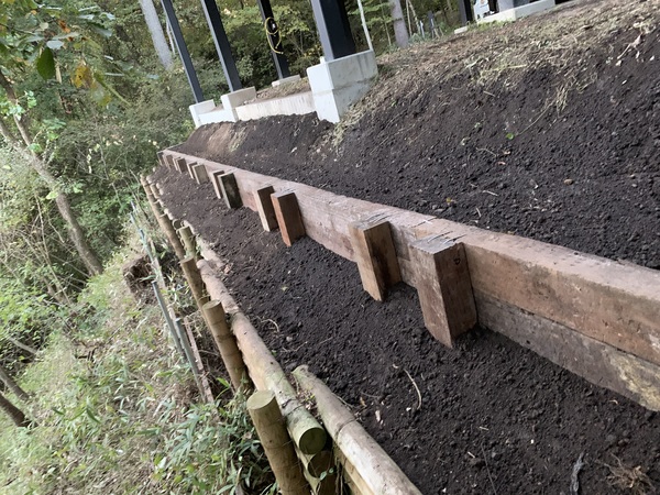 土留め枕木(枕木設置、法面整形完了)、整地、階段前枕木設置(完了)、