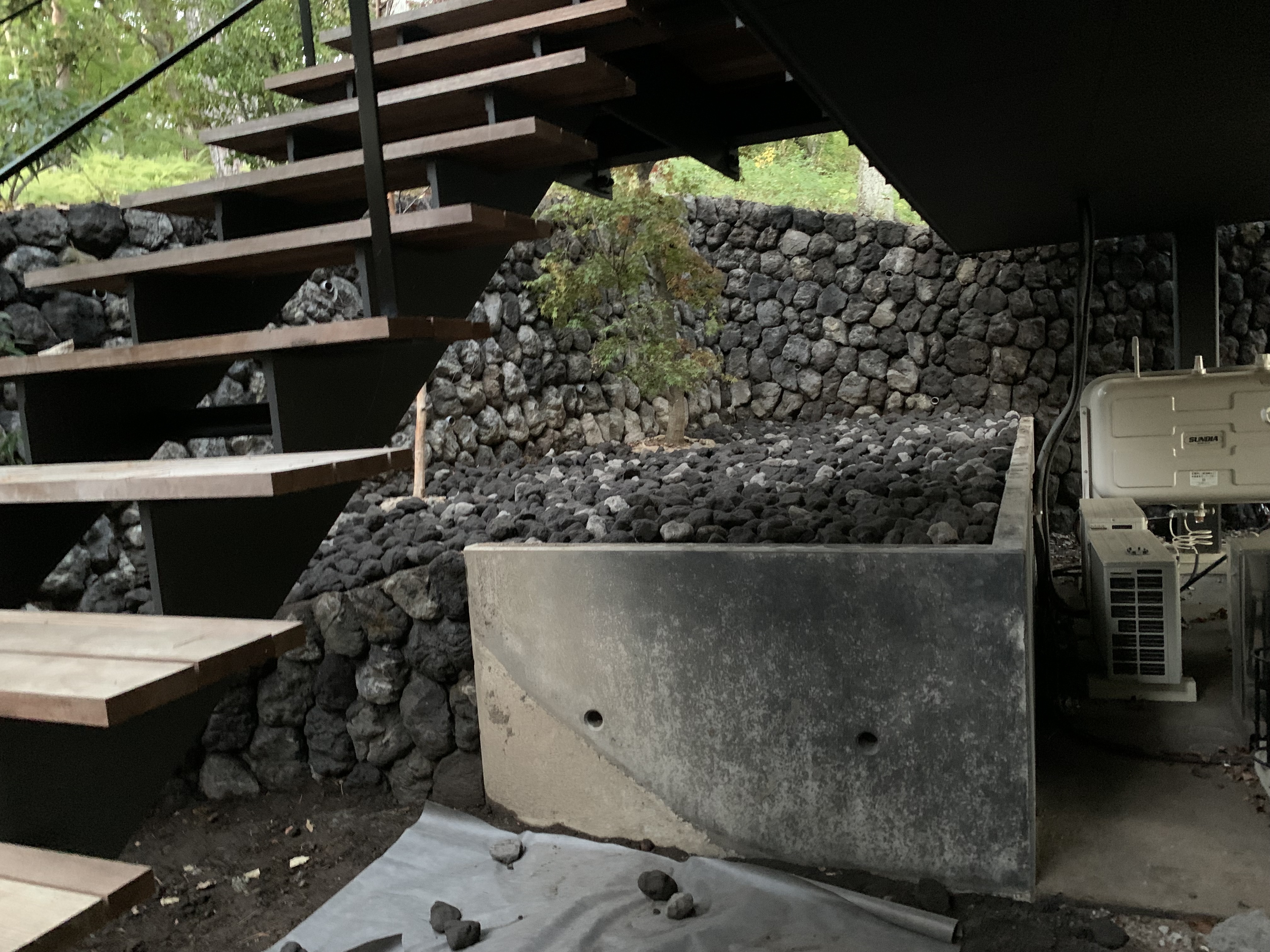 朝、置き場から浅間ビリ土嚢6袋積み込み現場へ運搬、石材屋さんから浅間石2立米現場へ運搬