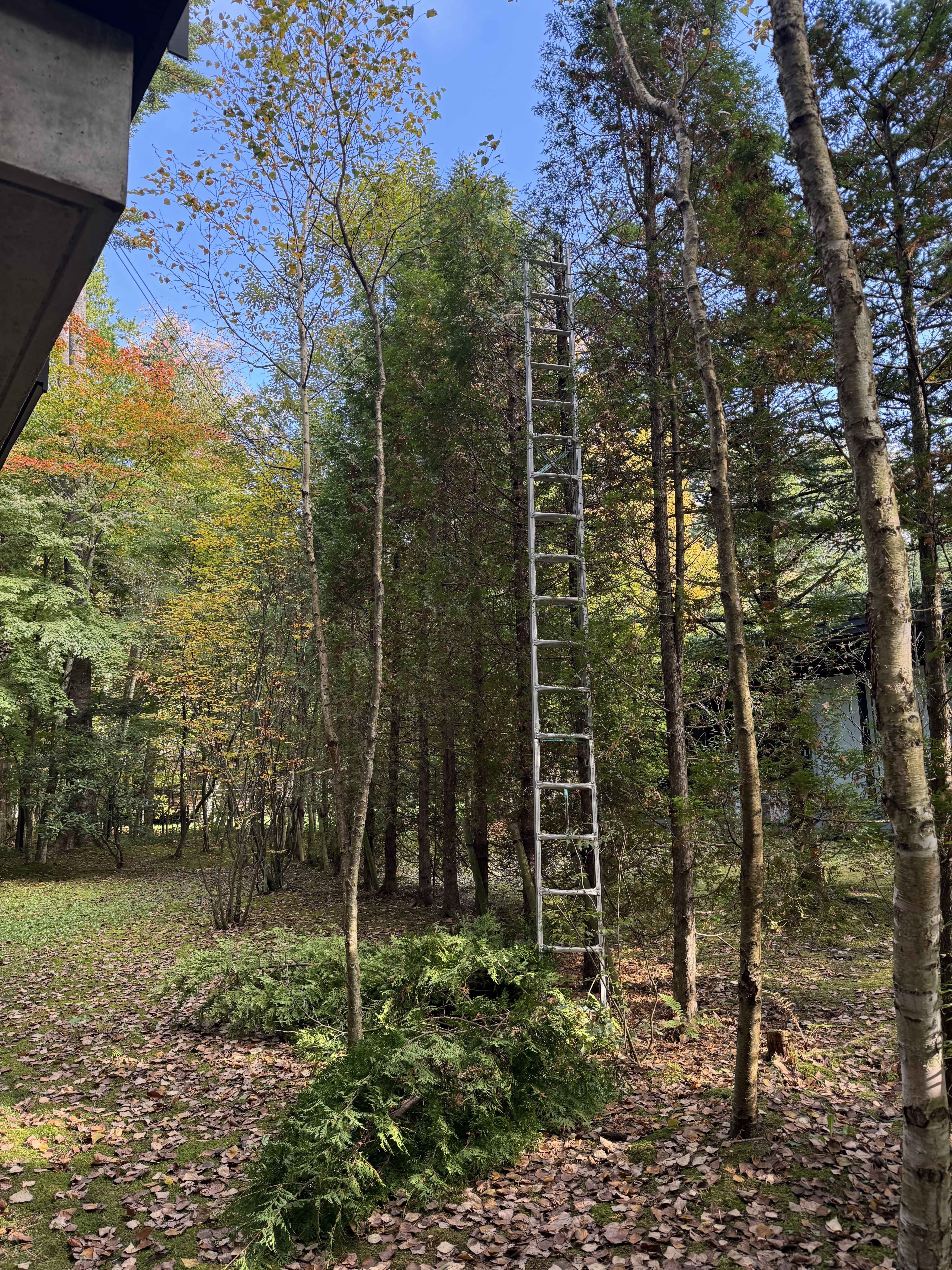 7時30分から10時45分、TOG様邸、サワラの頭止め、建物周りの枝払い、ゴミ片付け、枝ゴミ1台(処理場に運搬)