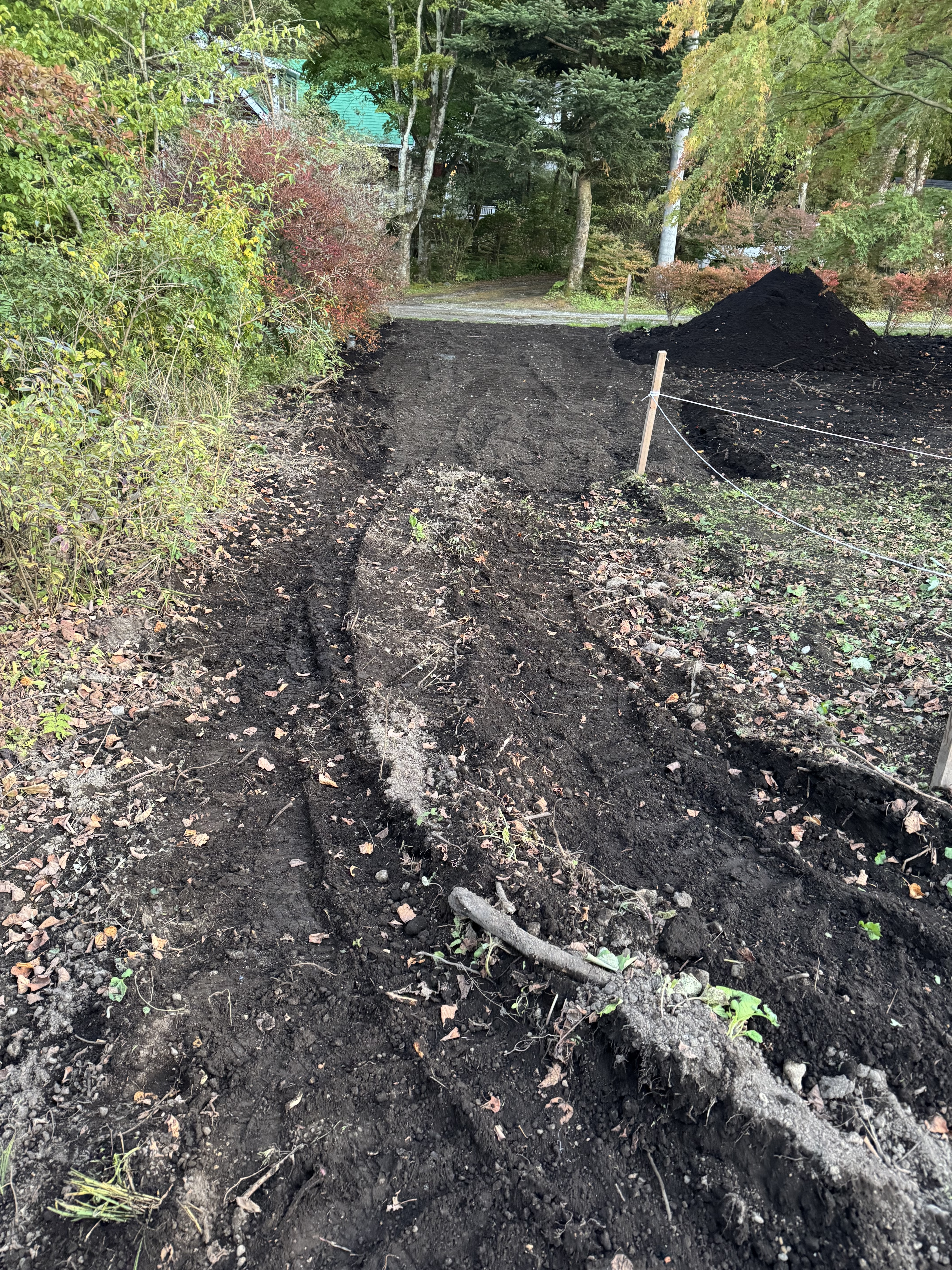 14時から17時、仮設道路の付け替え、砂利2台をはいで、敷きました。