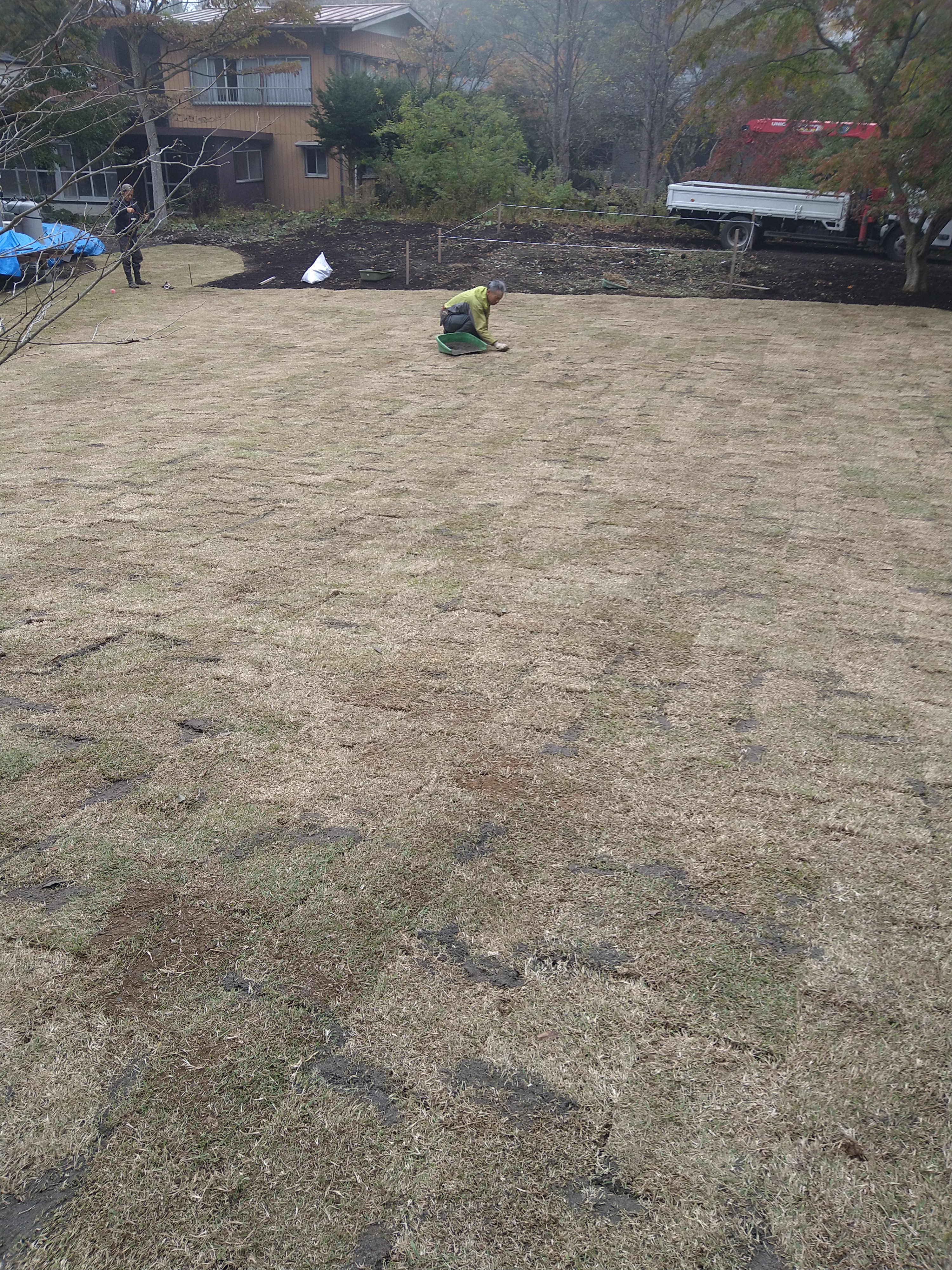 散水になったので、3パレットを別現場に移動していったので、そこに移動して芝張り、目土をしました!
