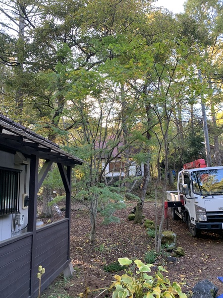剪定(11時からユニックに来てもらい高所剪定、完了)、掃除(枝ゴミ1台処理場へ運搬、ダンプ3割弱会社で処理)