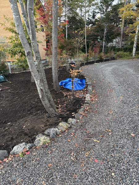 11時20分から16時50分、芝の下地作り、整地、ドウダン4本、ツツジ3本移植、シラカバ2本嵩上げ、黒土3台運搬、