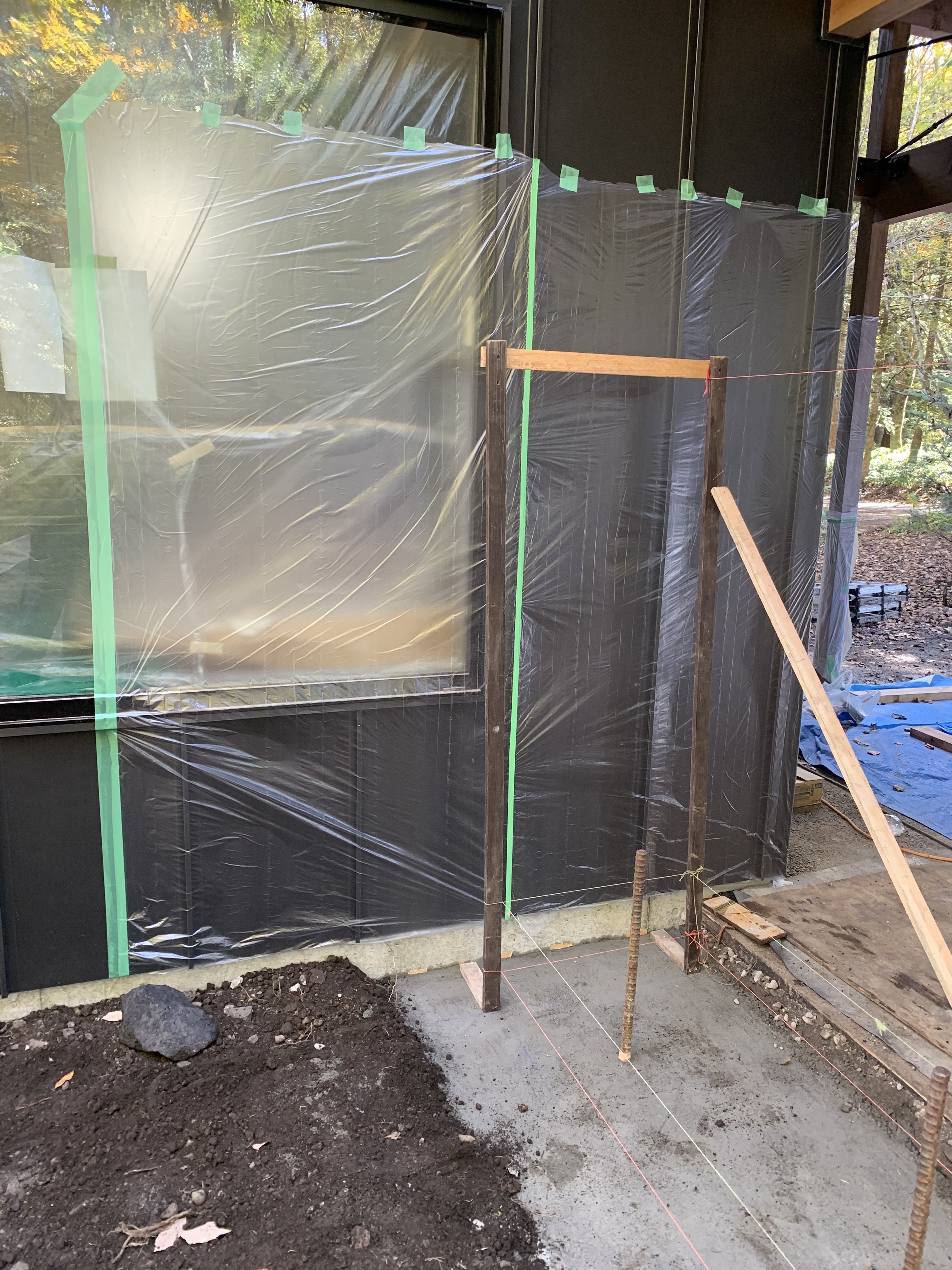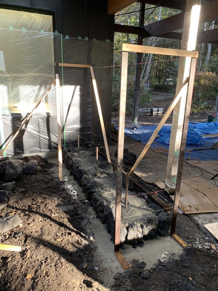 朝、石材屋さんから浅間石2立米現場へ運搬、石積み位置出し、丁張り出し、外壁養生、10時から社長とデザイナーさんと現場打ち合わせ、丁張り確認、石積み(1段半完了、モルタル打設、洗い)