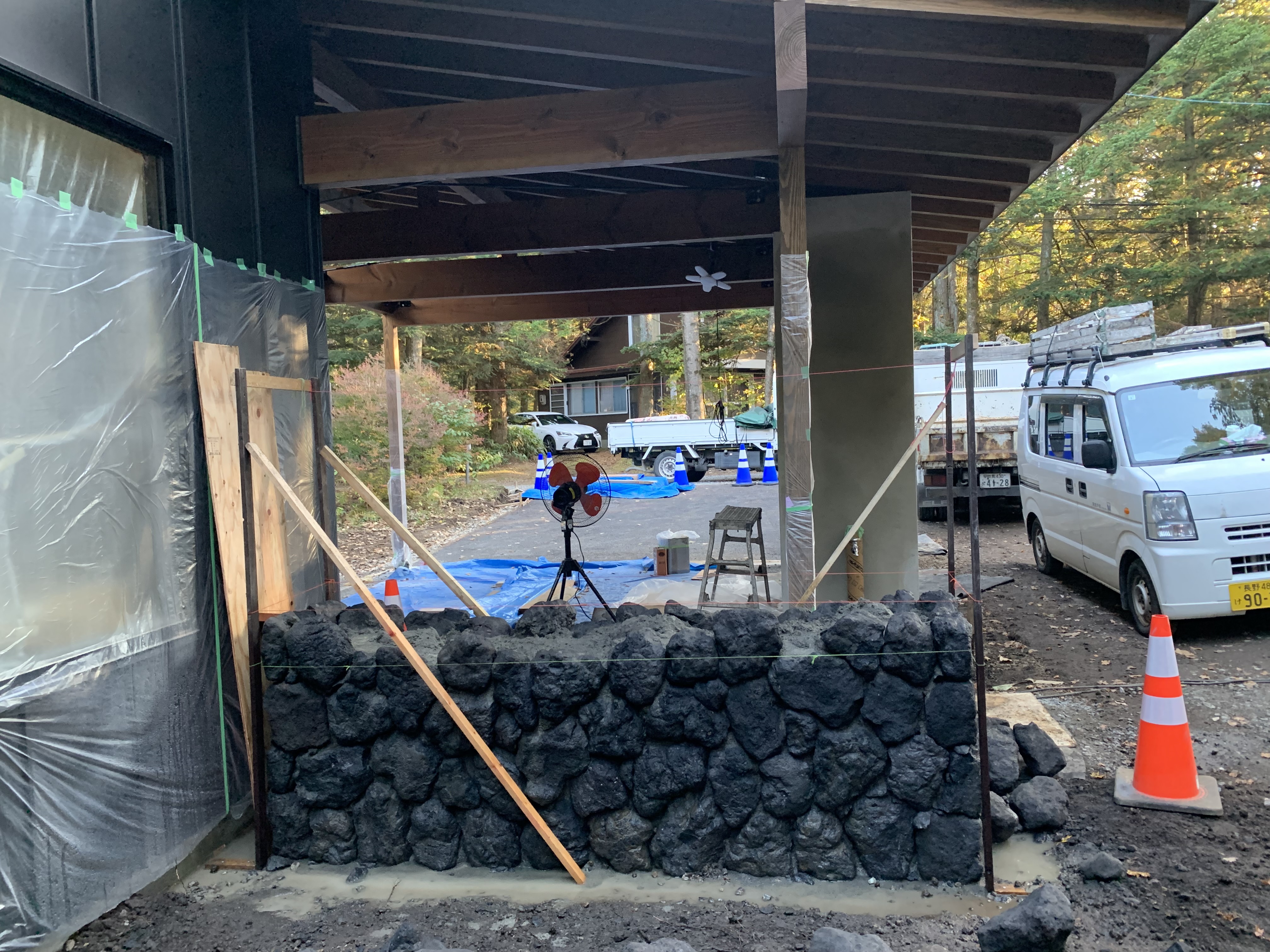 石積み(9段中4段目まで完了)、モルタル打設、洗い、資材屋さんから砂1.0立米運搬、置き場から浅間石100個拾い出し積み込み
