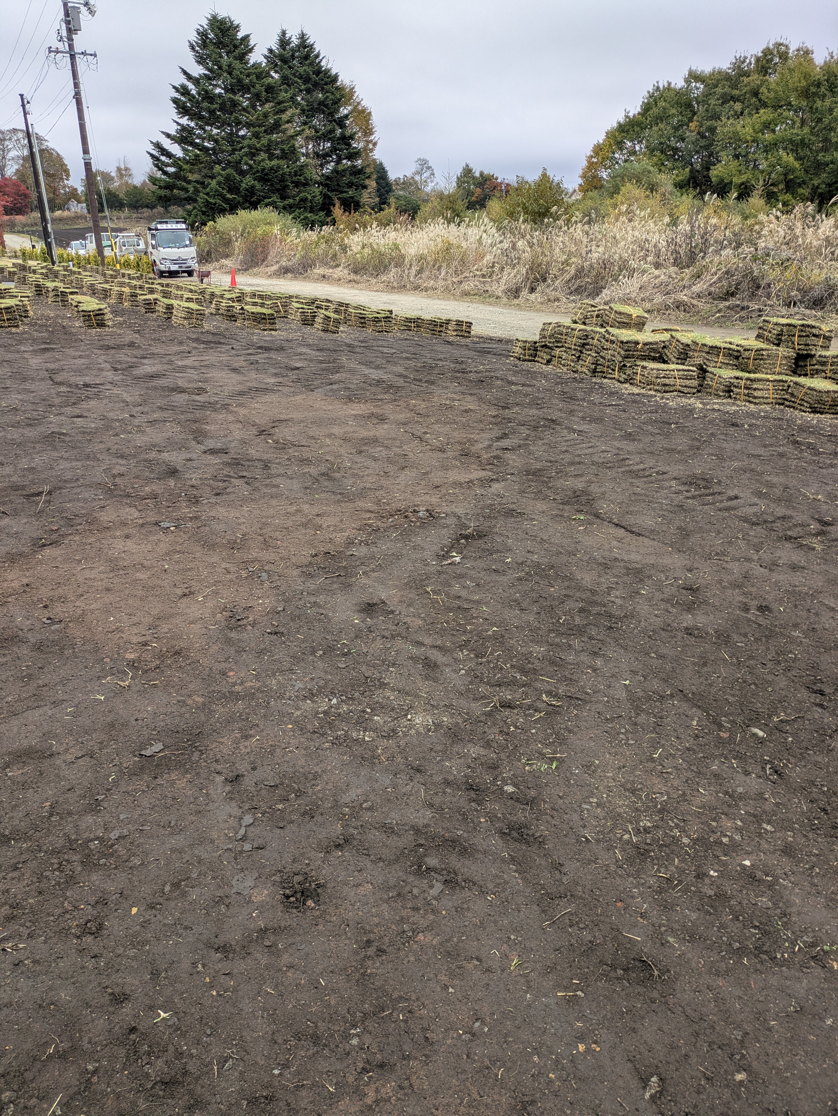 自社資材置き場から、前回芝を積んできたパレットを返却するので