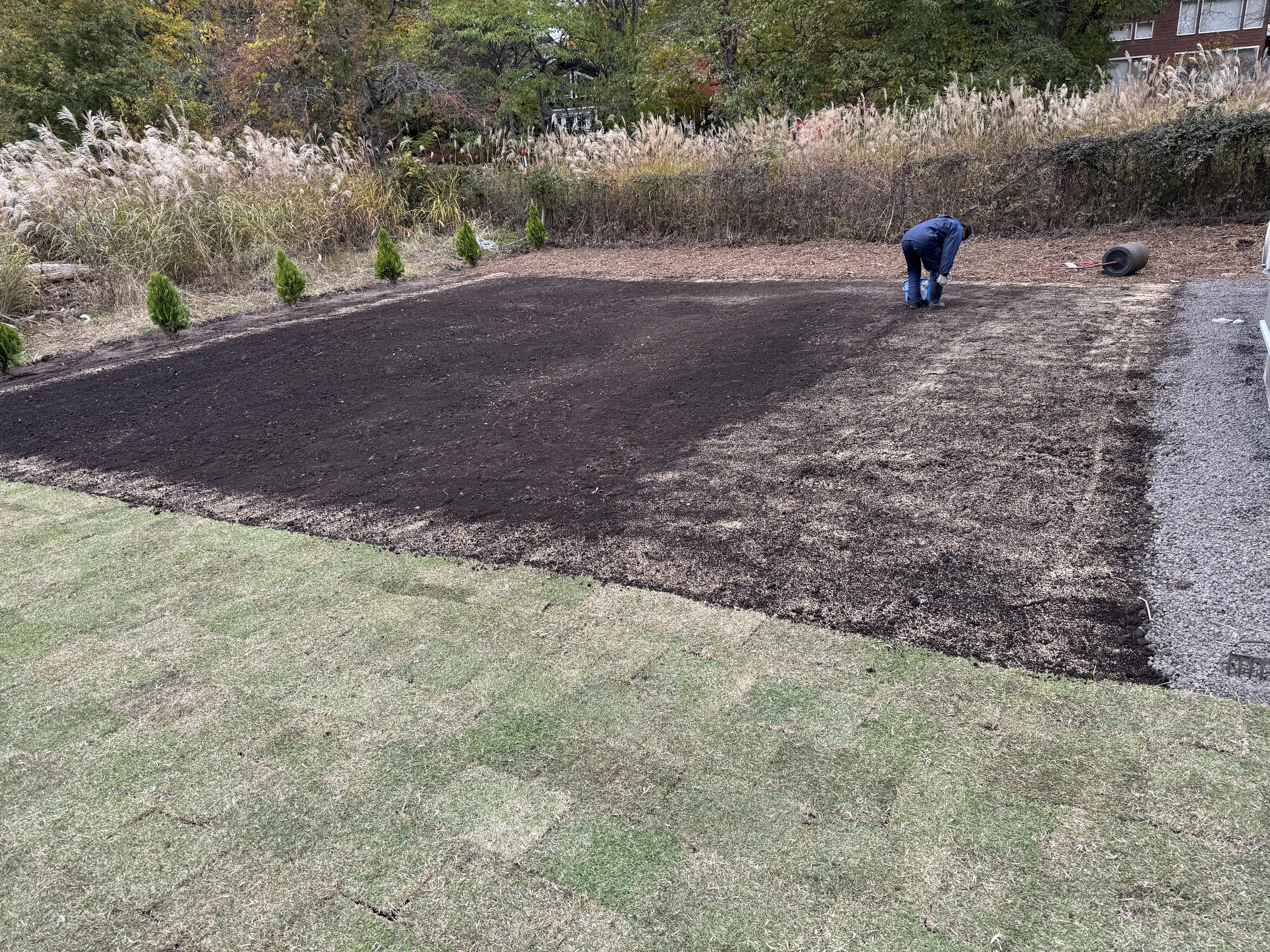 7時30分から16時15分、MYD様邸、芝張り450m2、整地、目土0.5m3