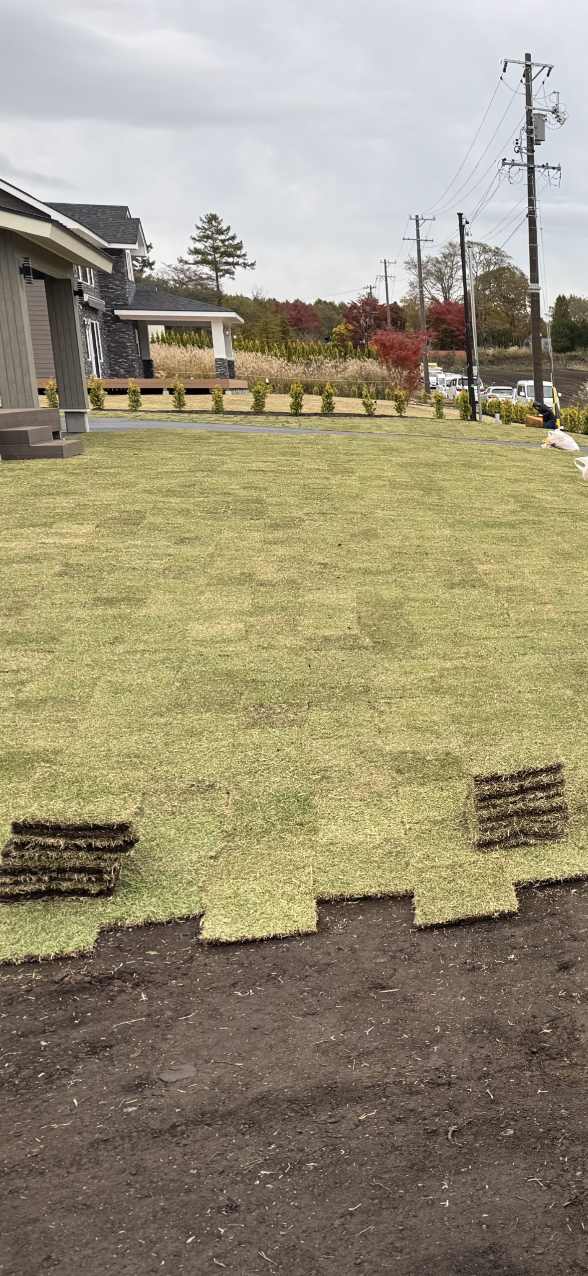 おろし終わり 芝張り。道路沿いを整地 目土 水やり。