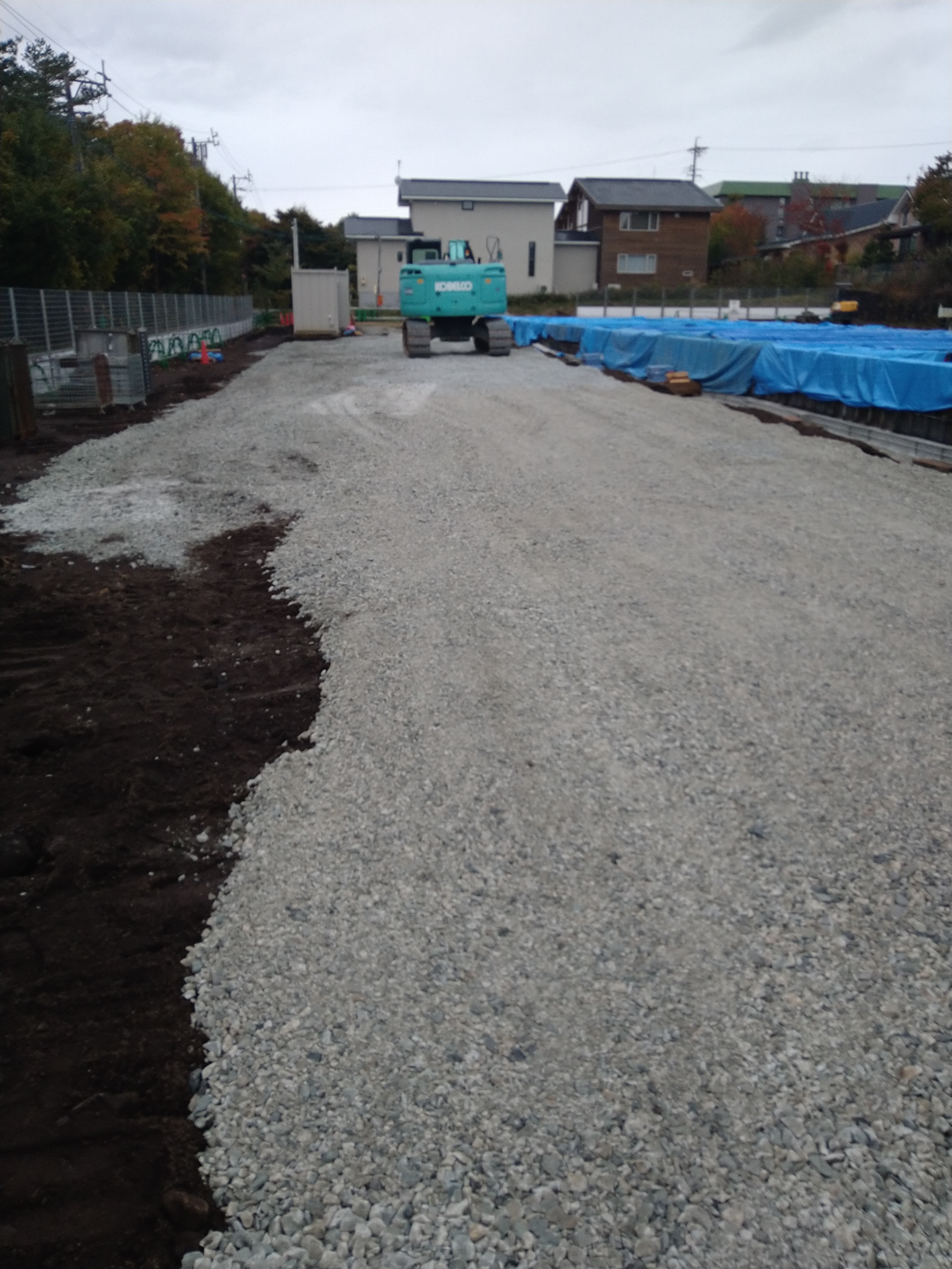8時からリモートKYをし、重機に給脂して砕石搬入準備をし、8時半から搬入、敷均しを始めました!
