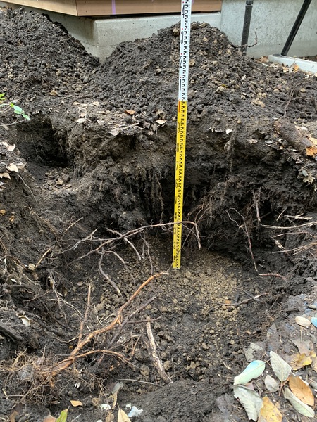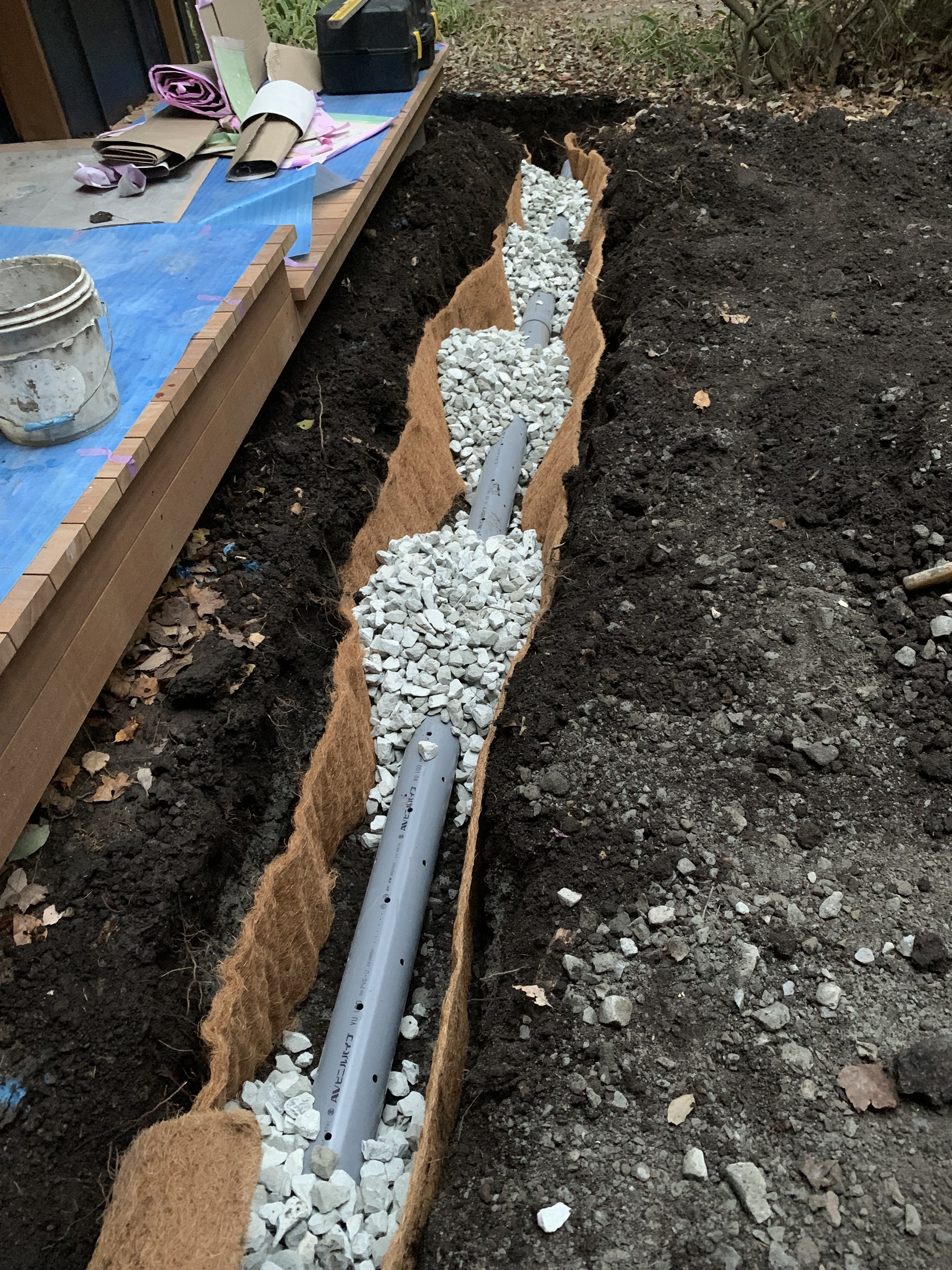 移植(モミ1本、ドウダン2本)、石積み(目地埋め)、暗渠(掘削、集水枡設置約10m、暗渠パイプ設置、単粒砕石埋め戻し、マット設置)