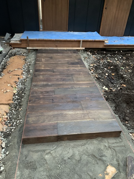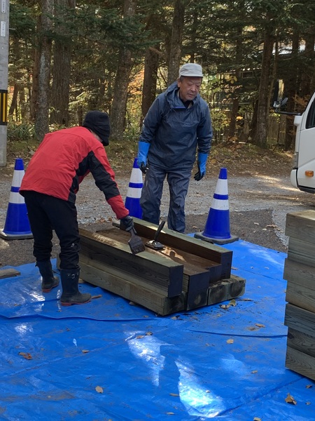 朝、資材屋さんから砂0.5立米現場へ運搬、暗渠埋め戻し、枕木下地掘削、転圧、11時頃枕木到着積み下ろし、枕木塗装、枕木設置(約4割完了)