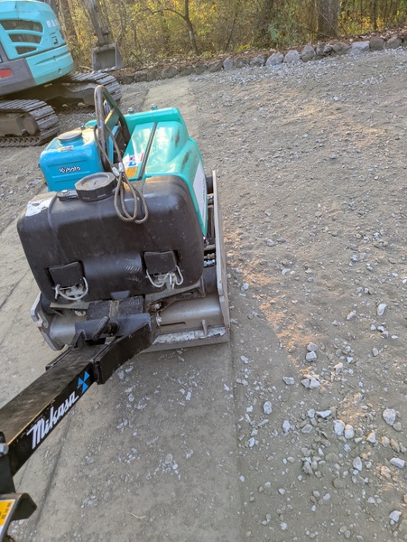 途中、CkM様邸の新コマツバックホーを自社資材置き場へ回送